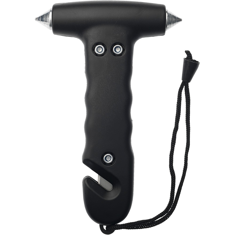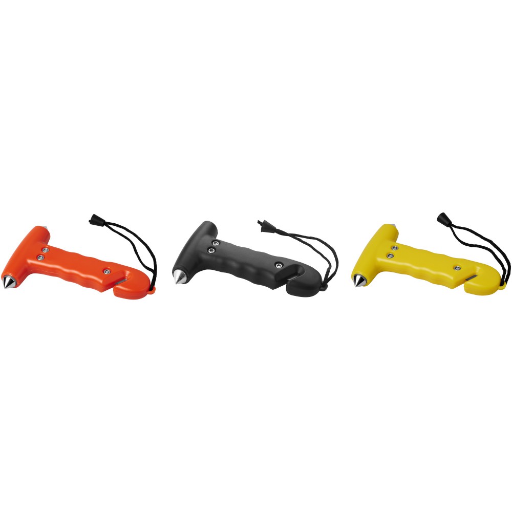 Kalapács vészhelyzet esetére, a markolatában a biztonsági öv elvágására alkalmas vágórésszel. Emblémázás: Tamponnyomás