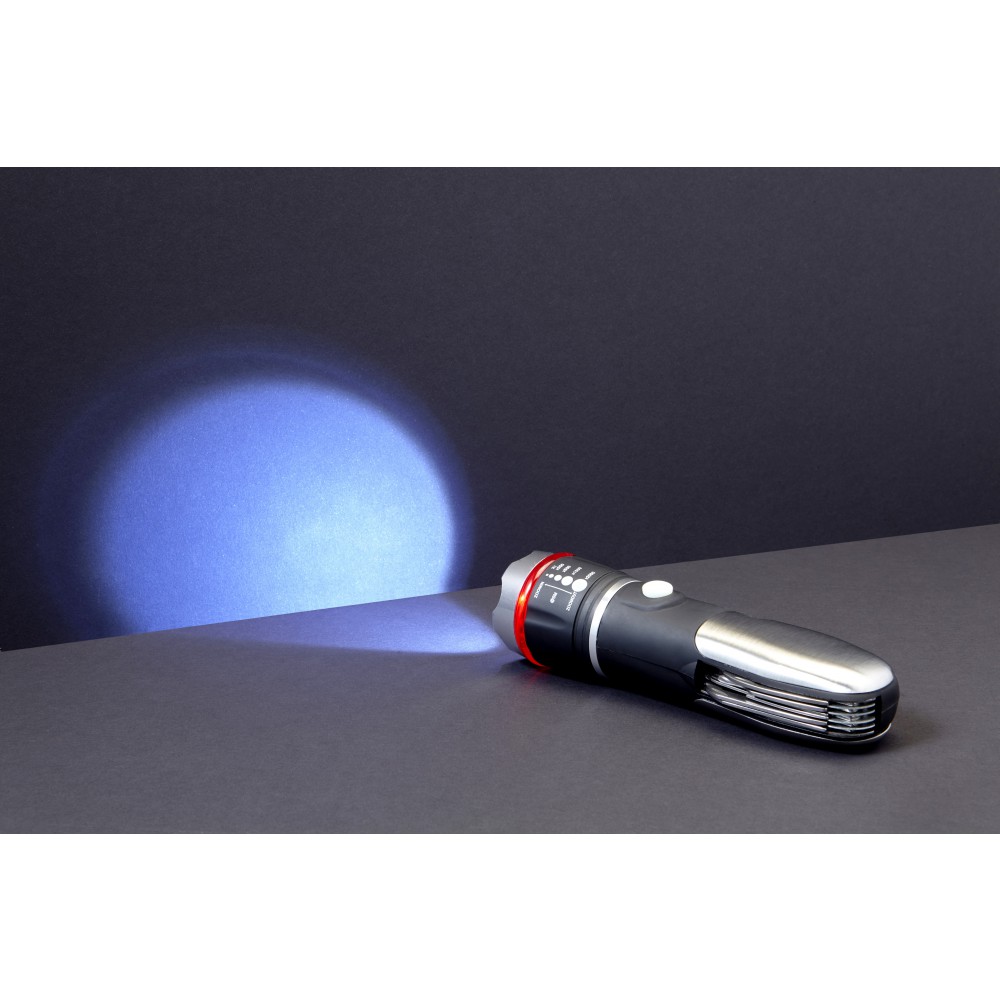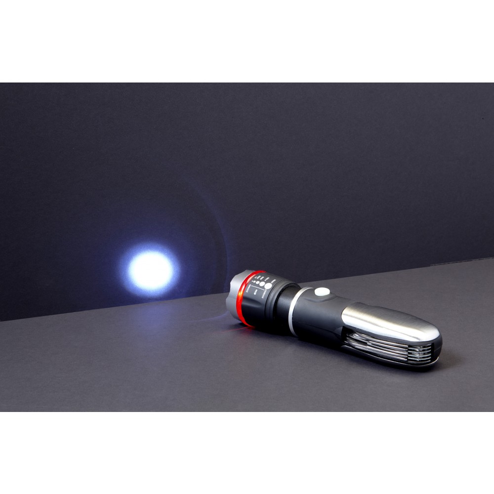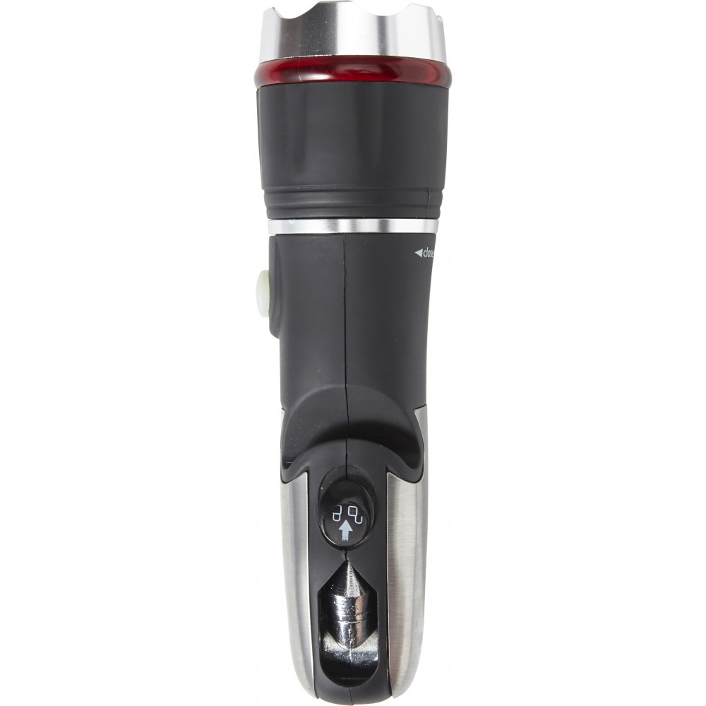 Lámpa biztonságiöv-vágóval, vészkalapáccsal. Az alsó részben kivehető zsebkés teszi igazán multifunkcióssá ezt az eszközt. Az elemet tartalmazza. Fém. Emblémázás: Gravírozás, Tamponnyomás