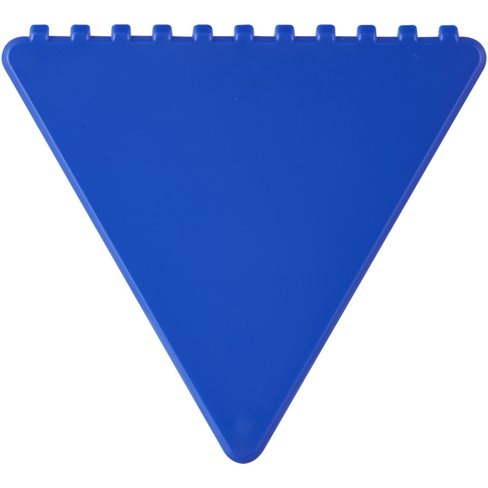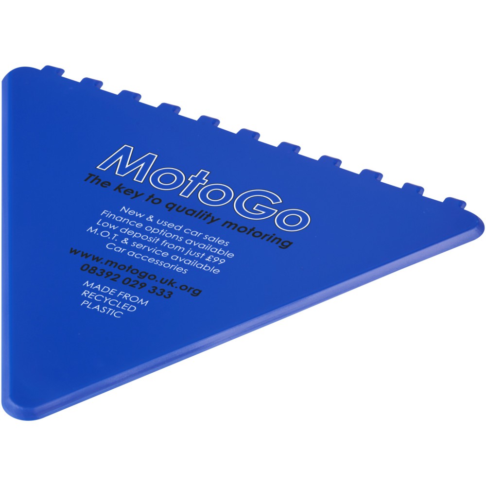 Háromszög alakú jégkaparó nagy emblémázható felülettel. Az Egyesült Királyságban készült újrahasznosított műanyagból. Emblémázás: Tamponnyomás, UV nyomtatás