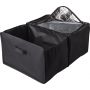 Autós rendező. Két rekesz, amelyből az egyik egy cipzárral zárható hűtőtáska alu szigeteléssel. Laposra hajtogatható. 600D poliészter. Emblémázás: Szitanyomás