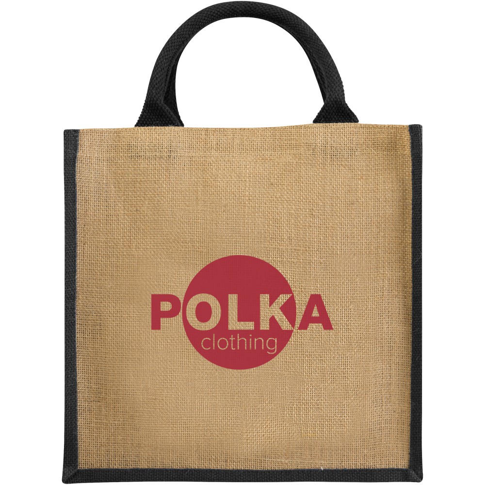 Nyitott tetejű jutaszatyor háromszög alakú oldalbetéttel. Sodort pamutfüllel. Emblémázás: Szitanyomás