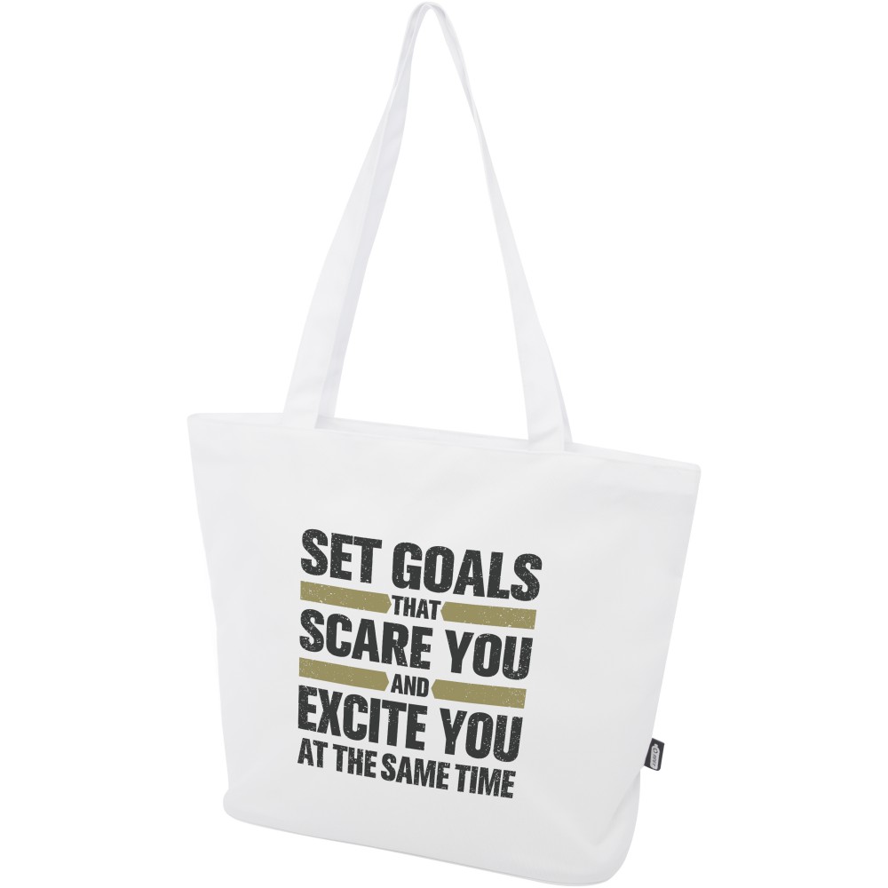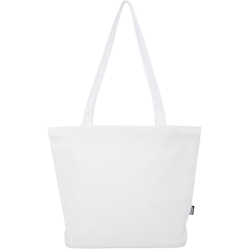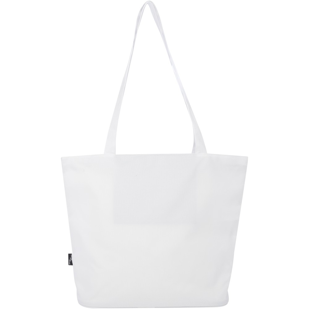 A vízlepergető 600D rPET anyagból készült Panama GRS újrahasznosított cipzáras táska tökéletes és fenntartható választás, ha rendezvényre, strandra vagy bevásárlásra készülsz. Egy cipzáras főrekesszel és egy cipzáras belső zsebbel rendelkezik, amely elég nagy a telefonod vagy más értékes holmi tárolására. Fülei 34 cm hosszúak, ezért a táska könnyen hordozható vállon. Teherbírás: 10 kg. PVC-mentes. Emblémázás: Szitanyomás