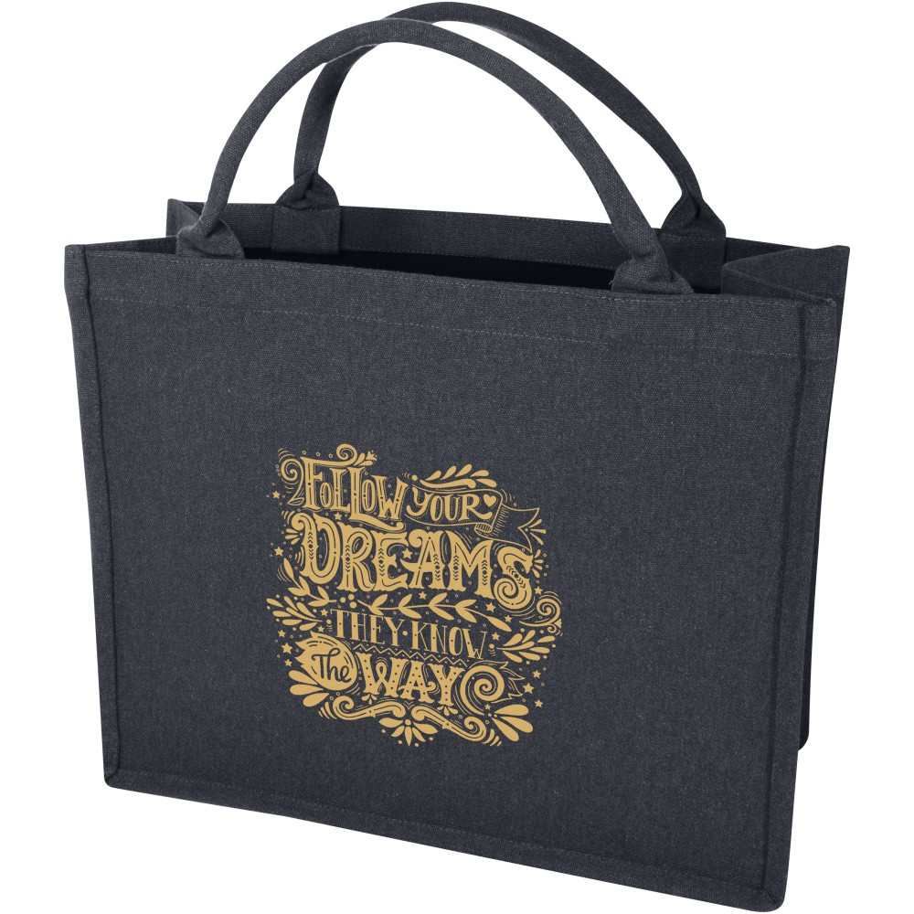 A Page újrahasznosított bevásárlótáska tökéletesen alkalmas a mindennapi tárgyak tárolására, utazásokhoz és bevásárlásokhoz. Rövid, de erős fülekkel ez a táska hosszú ideig kényelmesen hordozható. A táska Cyclo újrahasznosított szálakat tartalmaz, ahol előválogatott hulladékot használnak, amely meghatározza a fonal színét. Minden táskához egy Aware nyomjelző is tartozik. Ez az innovatív funkció lehetővé teszi a felhasználók számára, hogy egy QR-kód segítségével nyomon követhessék a termék eredetét és útját, növelve az ellátási lánc átláthatóságát és elősegítve a termék és a gyártási folyamat közötti szorosabb kapcsolatot. Méret: 42 x 18 x 35 cm. Emblémázás: Szitanyomás