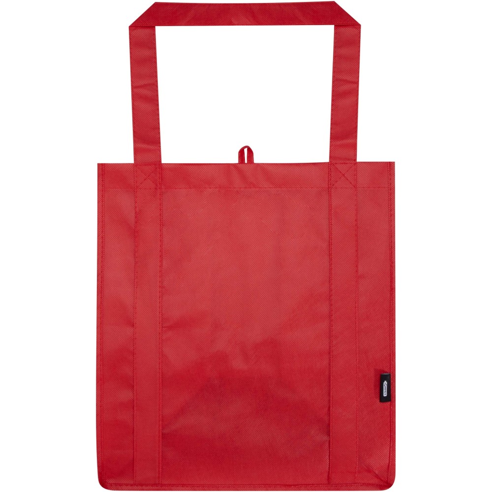A Liberty GRS tanúsítvánnyal rendelkező újrahasznosított bevásárlótáska tartós és szakadásálló nem szőtt RPET anyagból készült, megerősített aljrésszel, amely extra stabilitást és sokoldalú felhasználást biztosít. A táska nagy méretű főrekesszel és 25 cm hosszú fülekkel rendelkezik, így kényelmesen hordozható. Űrtartalma: 29 liter. Teherbírás: akár 12 kg. Emblémázás: Szitanyomás
