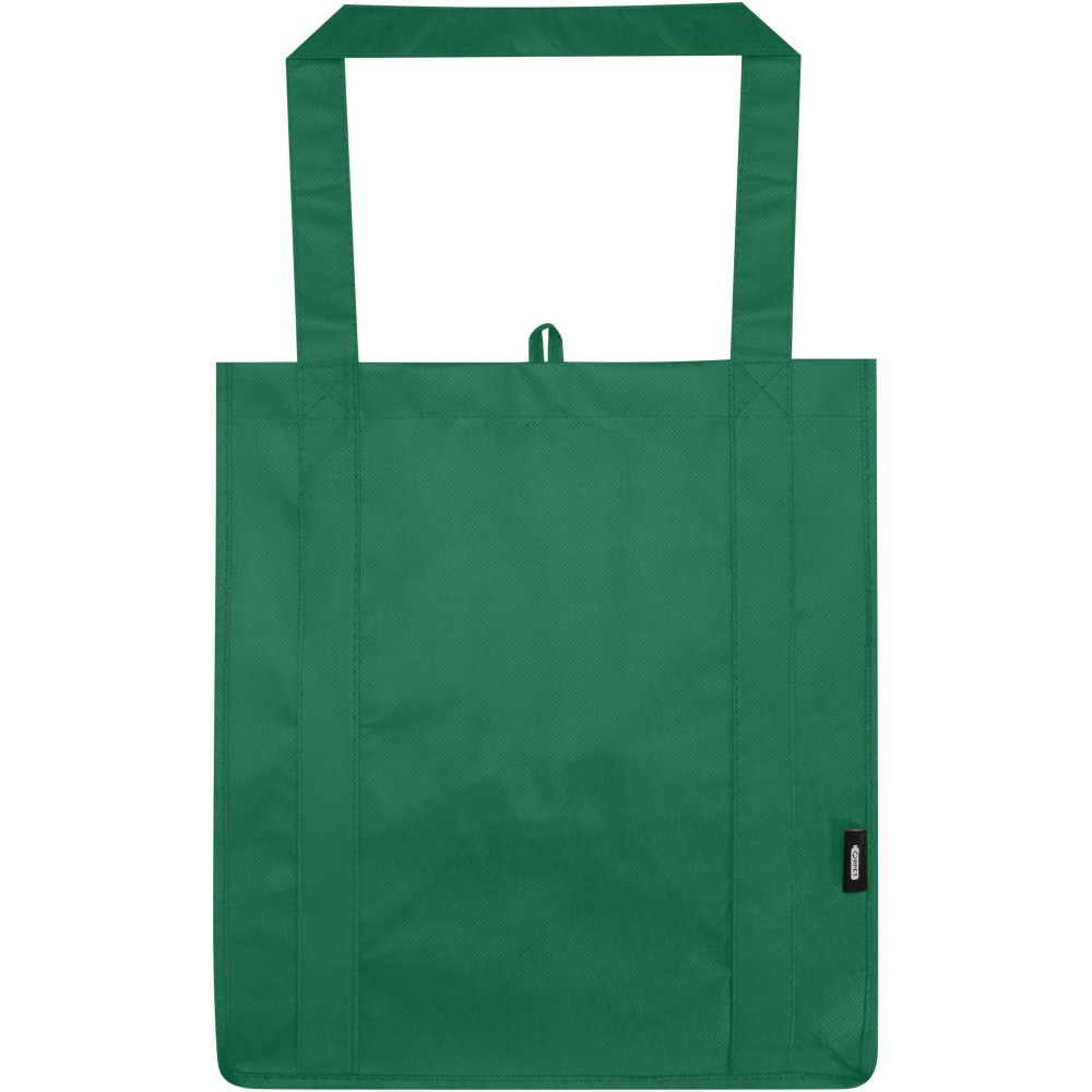 A Liberty GRS tanúsítvánnyal rendelkező újrahasznosított bevásárlótáska tartós és szakadásálló nem szőtt RPET anyagból készült, megerősített aljrésszel, amely extra stabilitást és sokoldalú felhasználást biztosít. A táska nagy méretű főrekesszel és 25 cm hosszú fülekkel rendelkezik, így kényelmesen hordozható. Űrtartalma: 29 liter. Teherbírás: akár 12 kg. Emblémázás: Szitanyomás