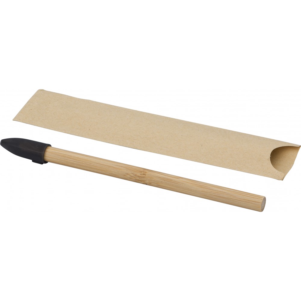 Bambusz ceruza újrahasznosított anyagból készült védőkupakkal. Csomagolása barna papírtok. Emblémázás: Tamponnyomás