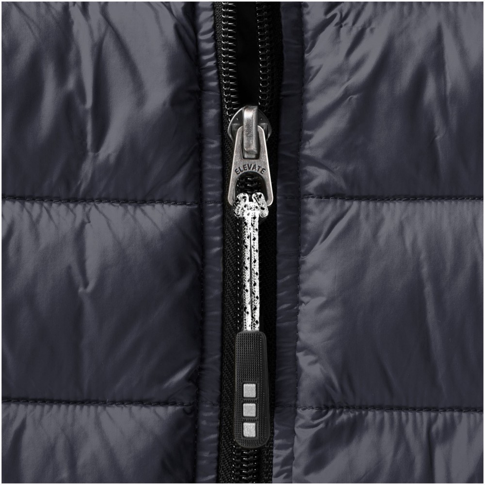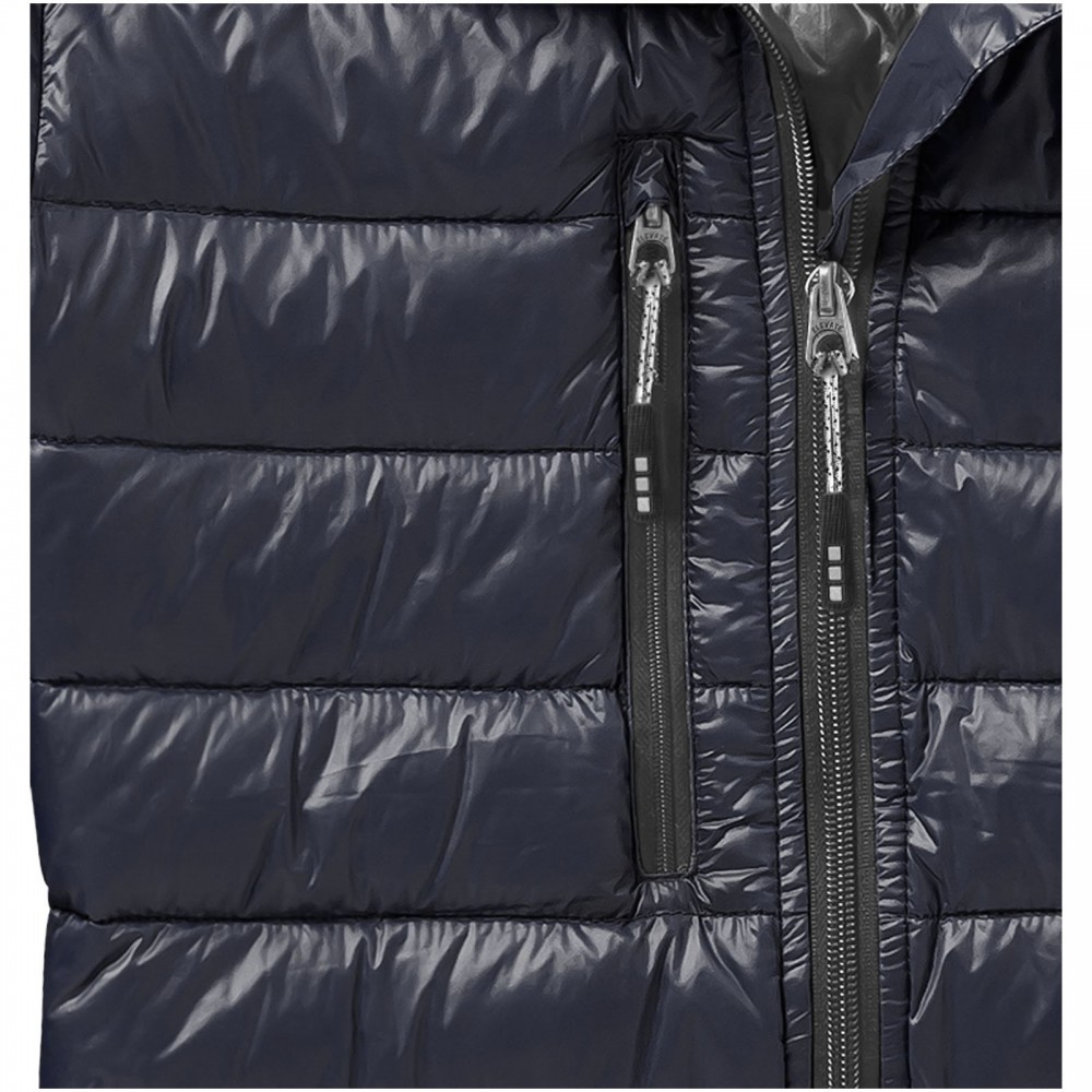 Normál szabásvonal. Pehelybiztos anyag. Cipzáros mell- és oldalzsebek. Emblémázásra alkalmas, cipzáros karzseb. Gumis szegély az aljon és a karöltőben. Könnyen megfogható cipzárhúzókák . Szél elleni állvédő betét a nyaknál. Vízlepergető, lélegző és szélálló. Hátul fényvisszaverő logónyomat . Könnyű, szigetelt pehelydzseki. 100% nylon, szőtt anyag, dupla vízlepergető bevonat, 20D. 80% pehely és 20% toll töltet. 115 g/m2 Emblémázás: Hímzés