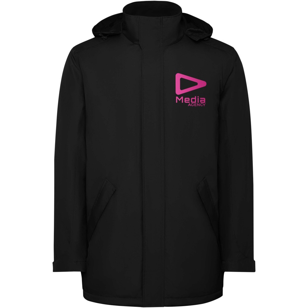 Vízálló bélelt parka férfiaknak. Magas gallérral és levehető kapucnival, tépőzáras záródással. Oldalsó zsebek cipzárral, belső zseb tépőzáras záródással. Állítható mandzsetták tépőzáras övhurkokkal. Belső hozzáférés a hátsó és a bal mellkasi megerősítésekhez. Emblémázás: Hímzés, Szitanyomás