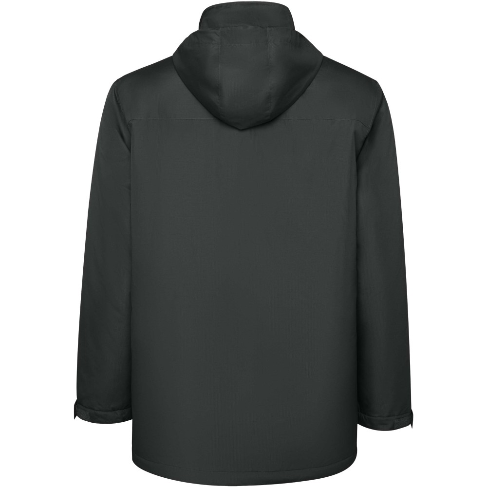 Vízálló bélelt parka férfiaknak. Magas gallérral és levehető kapucnival, tépőzáras záródással. Oldalsó zsebek cipzárral, belső zseb tépőzáras záródással. Állítható mandzsetták tépőzáras övhurkokkal. Belső hozzáférés a hátsó és a bal mellkasi megerősítésekhez. Emblémázás: Hímzés, Szitanyomás