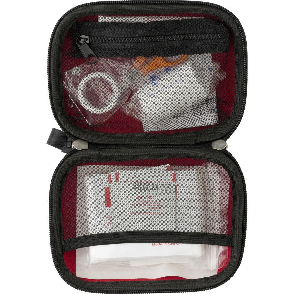 Elsősegélykészlet piros tokban. Tartalma: steril lap, ragtapaszok, biztosítótű, olló, 4 db alkoholos lap, 5 db steril ragtapasz stb. Emblémázás: Tamponnyomás