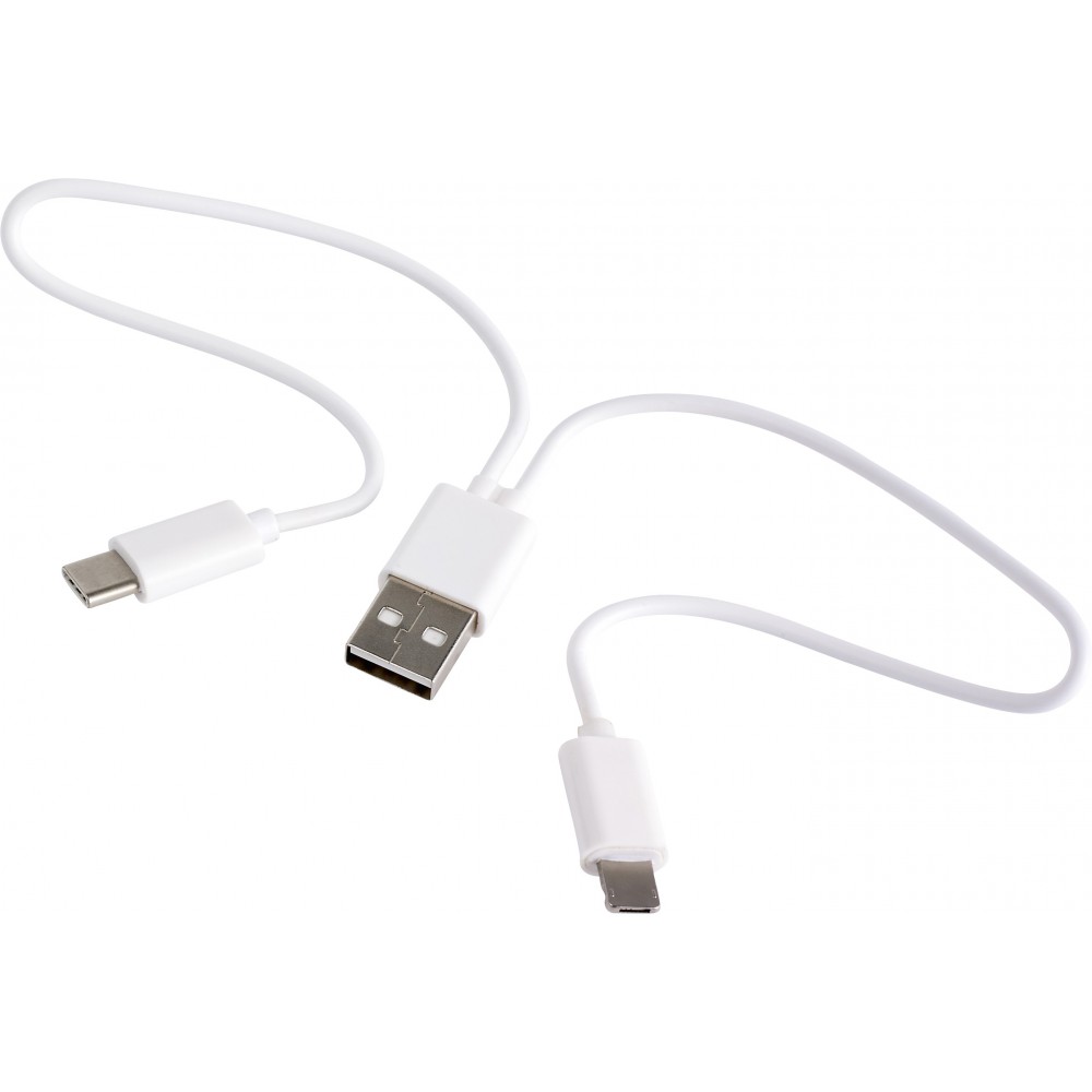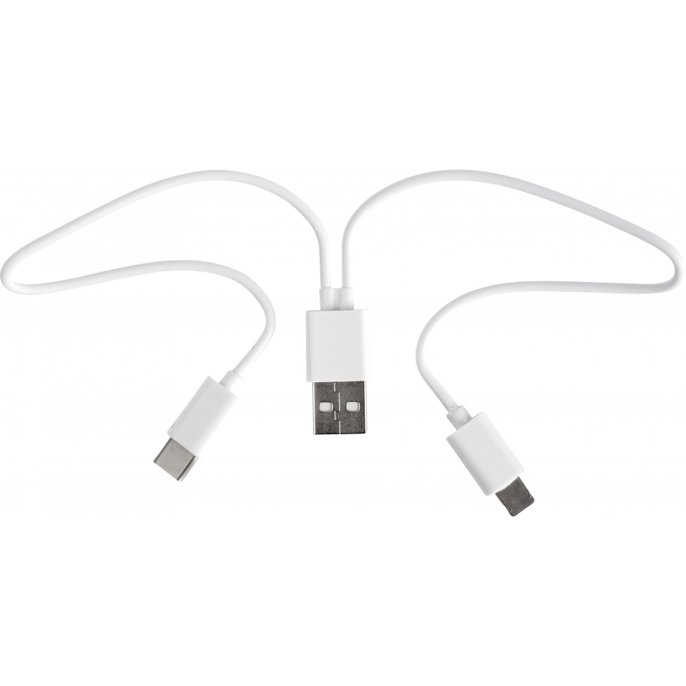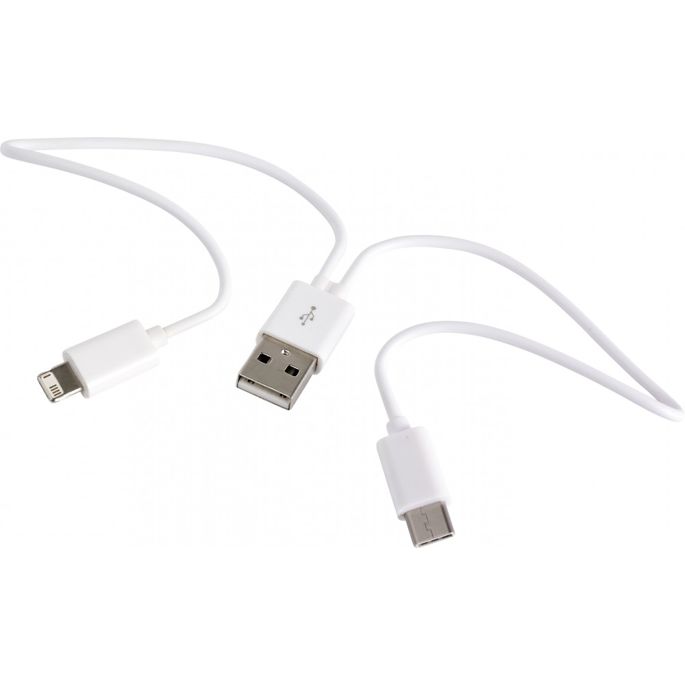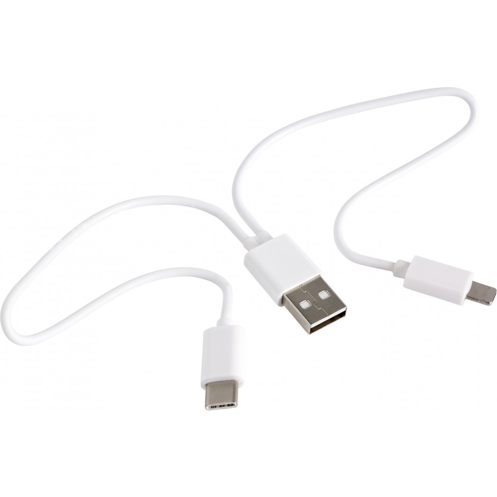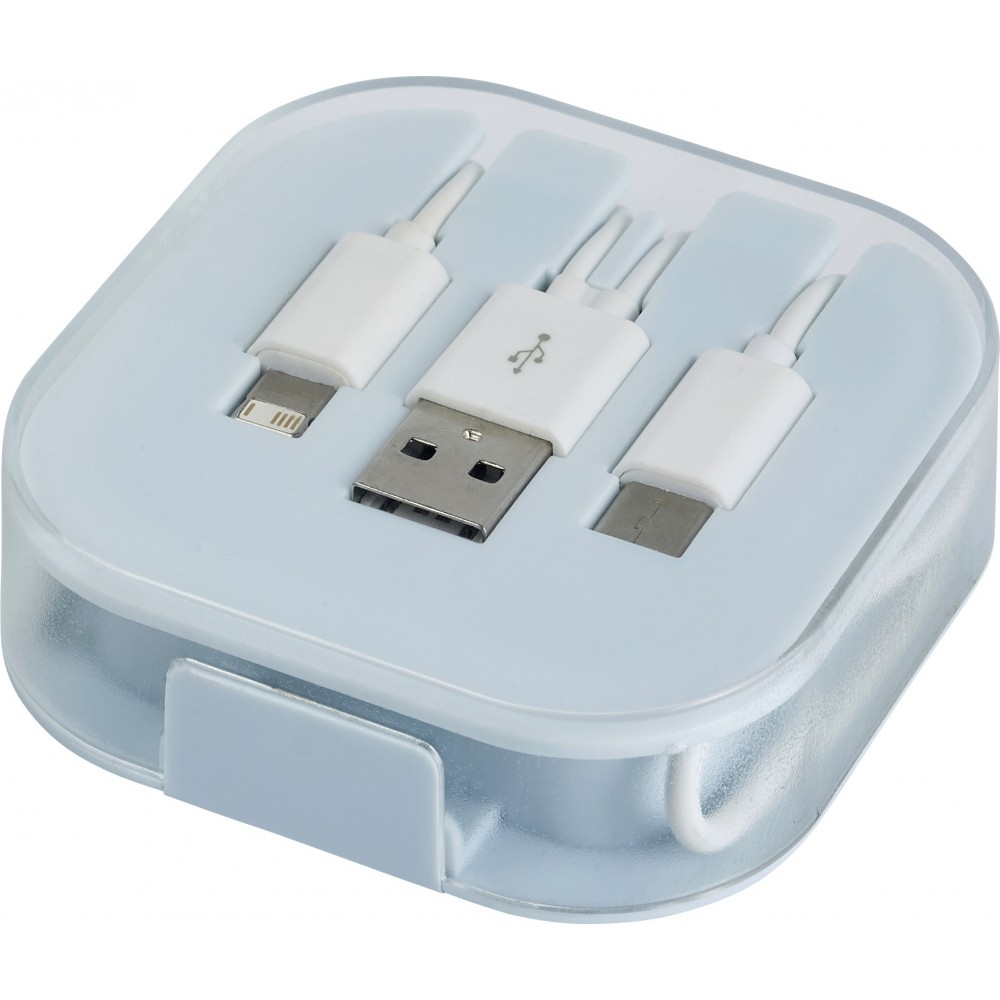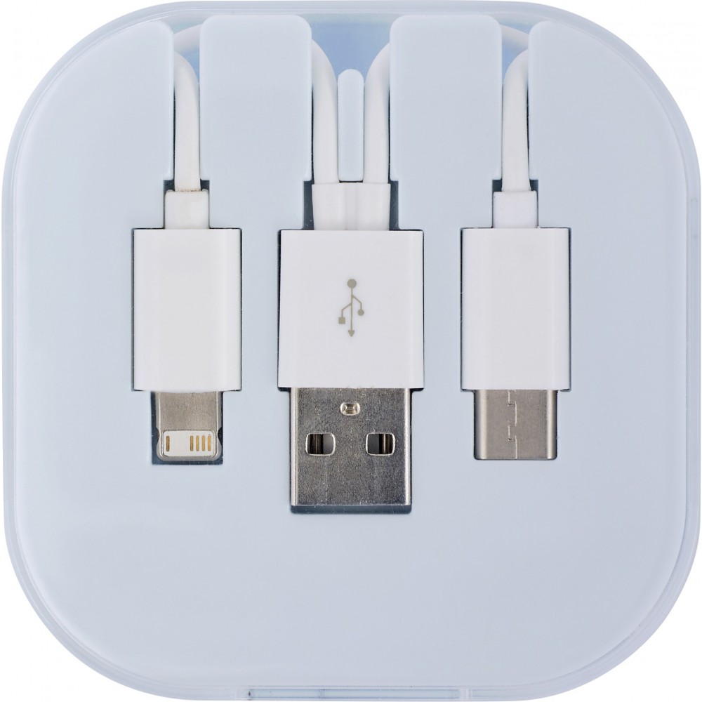 USB töltőkábel műanyag tokban. USB, USB-C és micro USB csatlakozóval rendelkezik. A micro USB csatlakozó átváltható Lightning csatlakozóra. A kábel hossza: kb. 24 cm. ABS, PVC, PS műanyag. Emblémázás: Tamponnyomás, UV nyomtatás