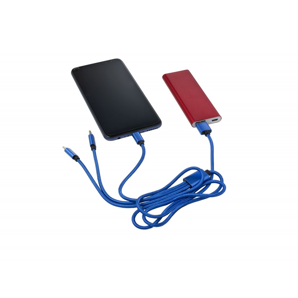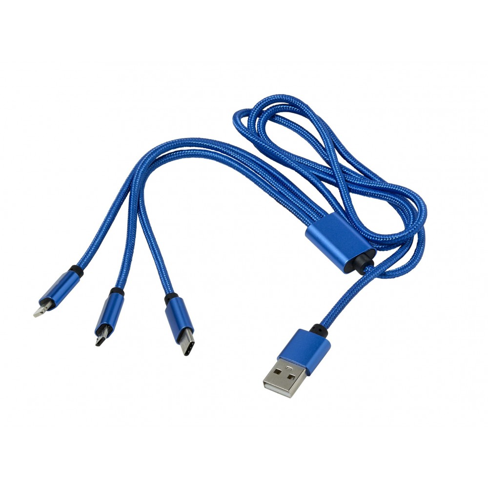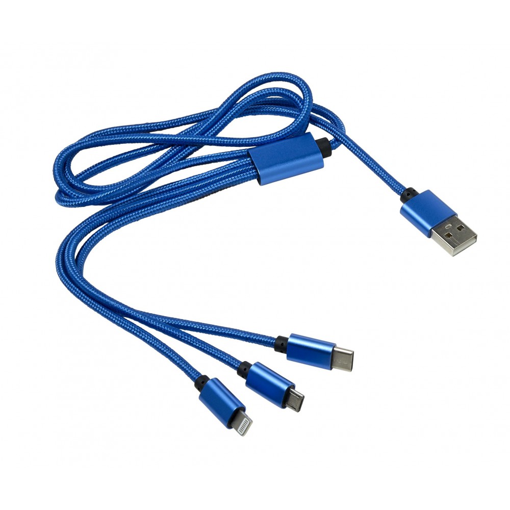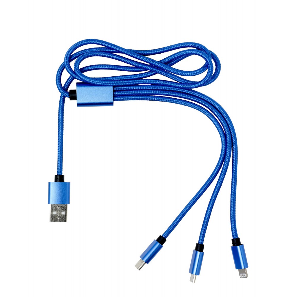 Töltőkábel az egyik végén USB csatlakozóval, a másik végén mikro USB, USB-C és Lightning csatlakozókkal. Nylon. Emblémázás: Gravírozás, Tamponnyomás