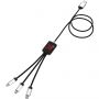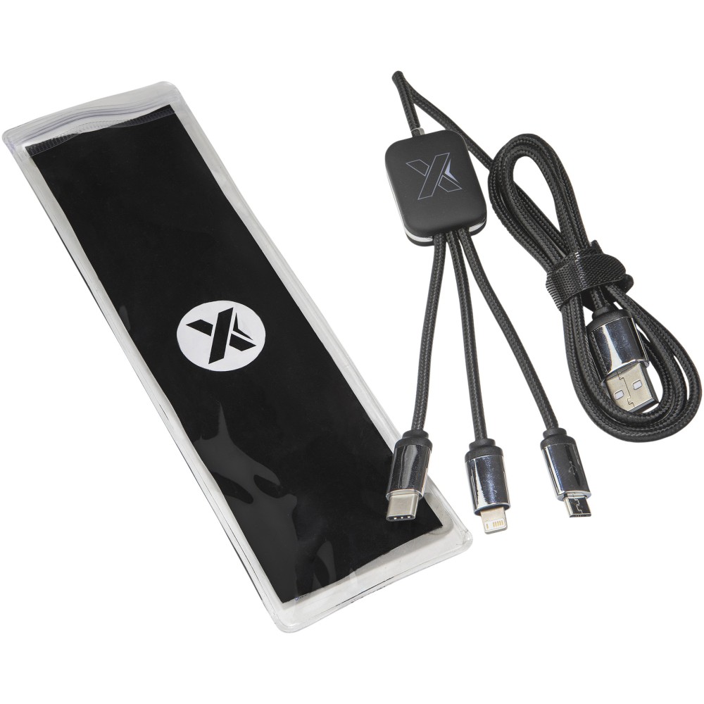 Világító logós töltőkábel gumi és fém bevonattal, három csatlakozóval (Type-C, Android, iPhone). Egyszerre akár három készülék is tölthető. Kábelek hossza (dugókkal együtt): 10 cm. Teljes kábelhossz: 1 méter. Az újrahasznosított PET műanyag kábel és csomagolás újrahasznosított papírból és újrahasznosított műanyagból készül. Emblémázás: Gravírozás