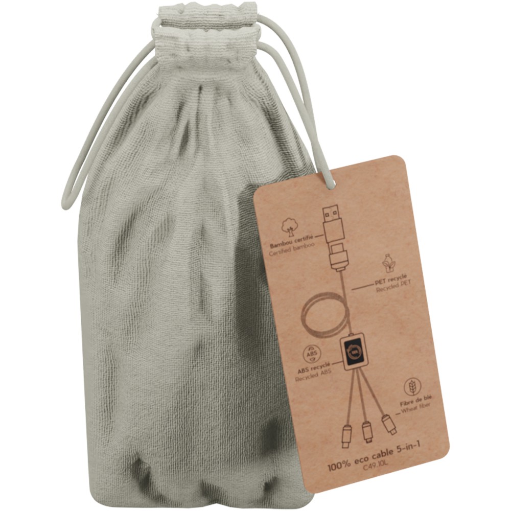 2,4A gyorstöltő kábel (3 x 10 cm), amely mindkét oldalán világító logóval emblémázható. Ez a kábel teljes egészében fenntarthatóbb anyagokból készült: rPET-zsinór, bambusz, búzaszál és újrahasznosított műanyag. A töltőkábel 3 kimenetének (Type-C, Android, iPhone) köszönhetően univerzális és akár három eszközt is képes egyszerre tölteni. Dupla USB és USB-C bemenetének köszönhetően ez a kábel kompatibilis a legújabb töltőkkel. Pamut tasakban (20 x 8 cm) szállítjuk. Emblémázás: Gravírozás