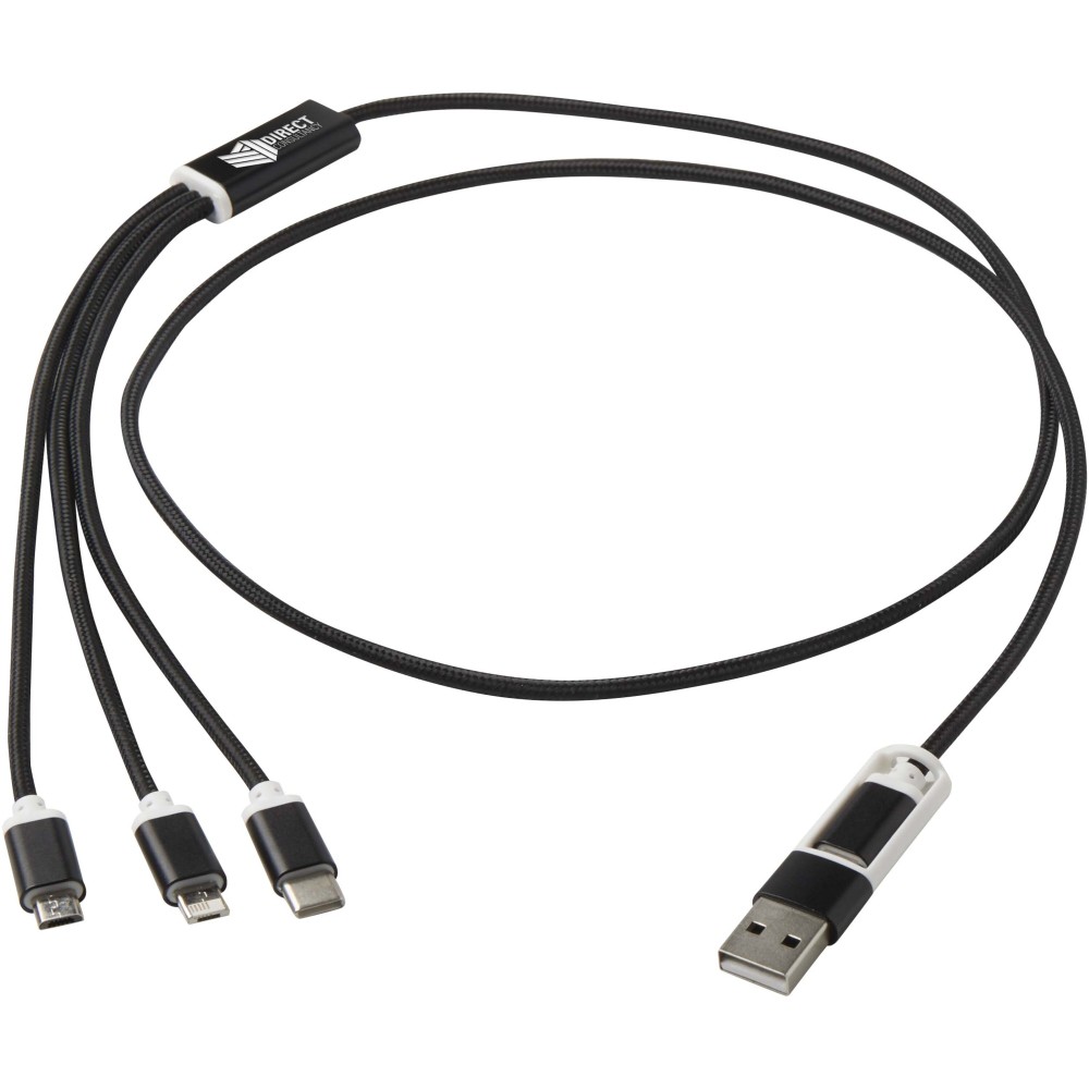 Ez a kábel USB-A és Type-C bemeneti csatlakozóval, valamint Type-C, Micro USB és Lightning/Micro USB kombinált kimeneti csatlakozóval rendelkezik. A csatlakozóknak köszönhetően a legtöbb iOS/Android okostelefont, fényképezőgépet, powerbankot és fülhallgatót töltheted. A kábel hossza 100 cm, újrahasznosított alumíniumból és RPET-ből készült. Emblémázás: Gravírozás, Tamponnyomás