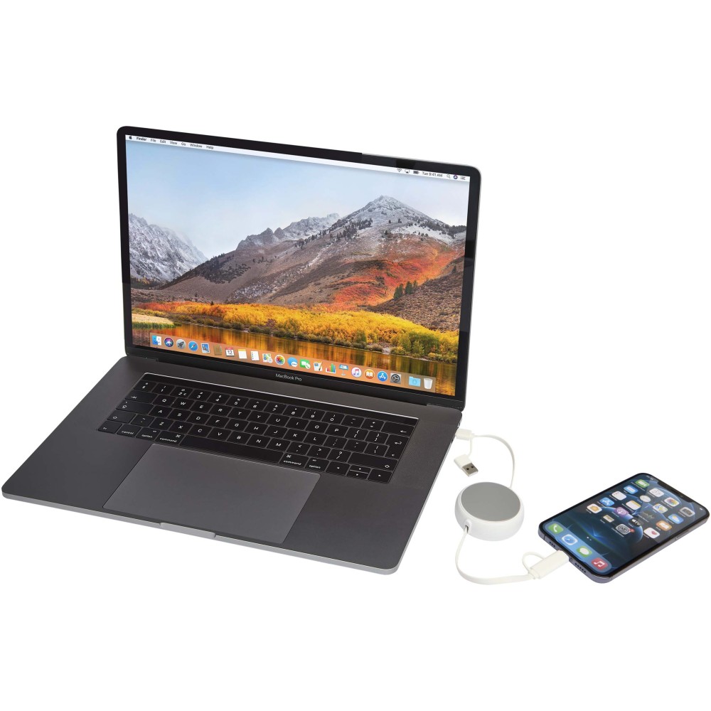 Az Alasia 5 az 1-ben visszahúzható adat- és 45W-os gyorstöltő kábel újrahasznosított műanyagból készült, tartós és stílusos újrahasznosított alumínium elemmel, amely fenntarthatóbb és elegáns töltési megoldást kínál. A kábel USB-A és Type-C bemeneti csatlakozókat, valamint egy 3 az 1-ben Type-C és Lightning/Micro USB kombinált kimeneti csatlakozót tartalmaz. Az USB-C?USB-C kapcsolat maximális teljesítménye 45W, az USB-A?USB-C kapcsolaté 24W, míg az összes többi kapcsolat maximális teljesítménye 15W. Kompatibilis a CarPlay és az Android Auto rendszerekkel, és beépített telefontartóval is rendelkezik a további kényelem érdekében. Akár otthon, az irodában vagy útközben használod, az Alasia kábel teljesítményt és stílust garantál. Kábel hossza: 100 cm. Emblémázás: Gravírozás, Tamponnyomás