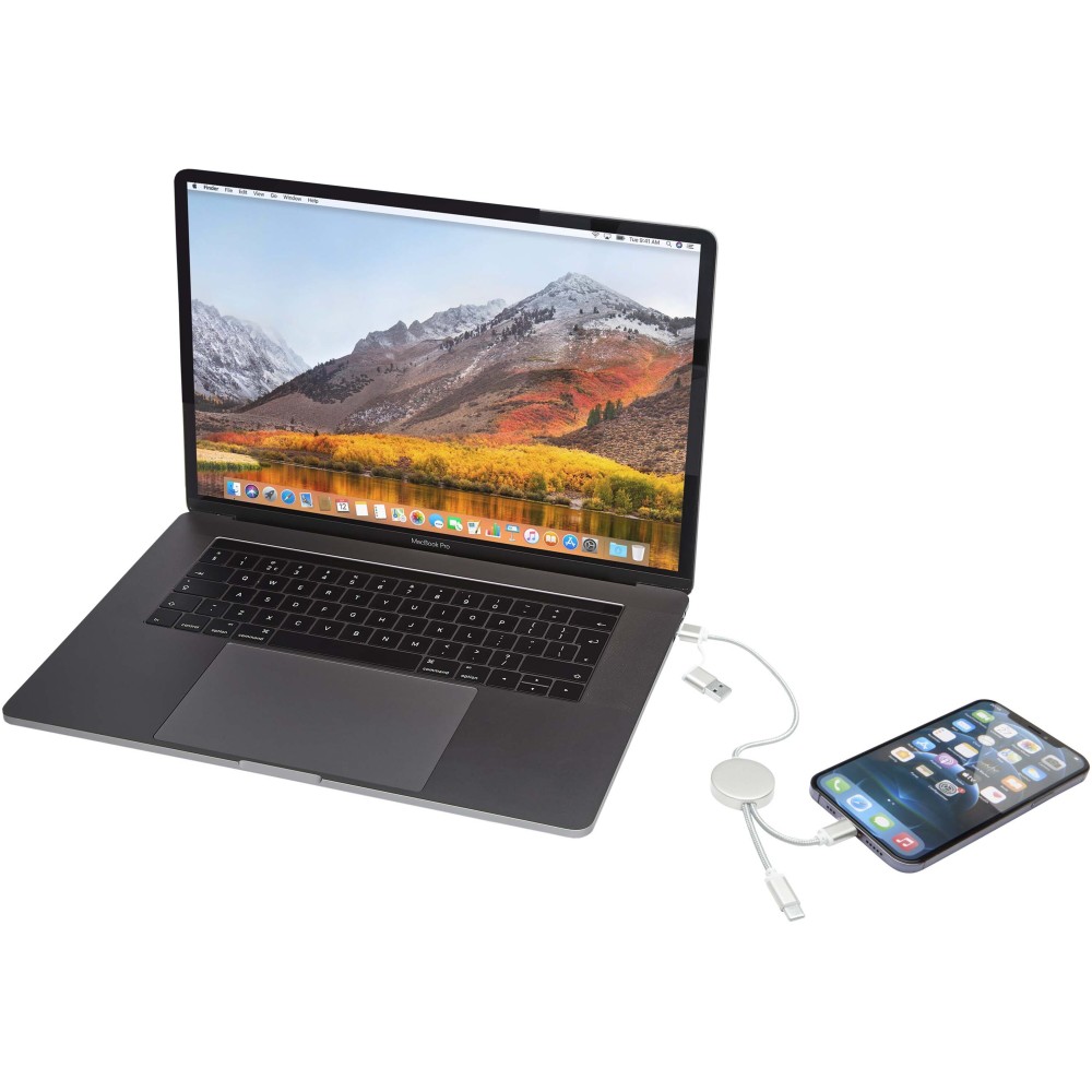 Az Alasia 5 az 1-ben adat- és 27W-os gyorstöltő kábel tartós és elegáns újrahasznosított alumíniumból és műanyagból készült. A kábel USB-A és Type-C bemeneti csatlakozókkal, valamint Type-C és Lightning/Micro USB kombinált kimeneti csatlakozóval rendelkezik. Az USB-A?USB-C kapcsolat maximális teljesítménye 27W, míg az összes többi kapcsolat maximális teljesítménye 15W. Kompatibilis a CarPlay és az Android Auto rendszerekkel. Akár otthon, az irodában vagy útközben használod, az Alasia kábel teljesítményt és stílust garantál. Kábel hossza: 30 cm. Emblémázás: Gravírozás