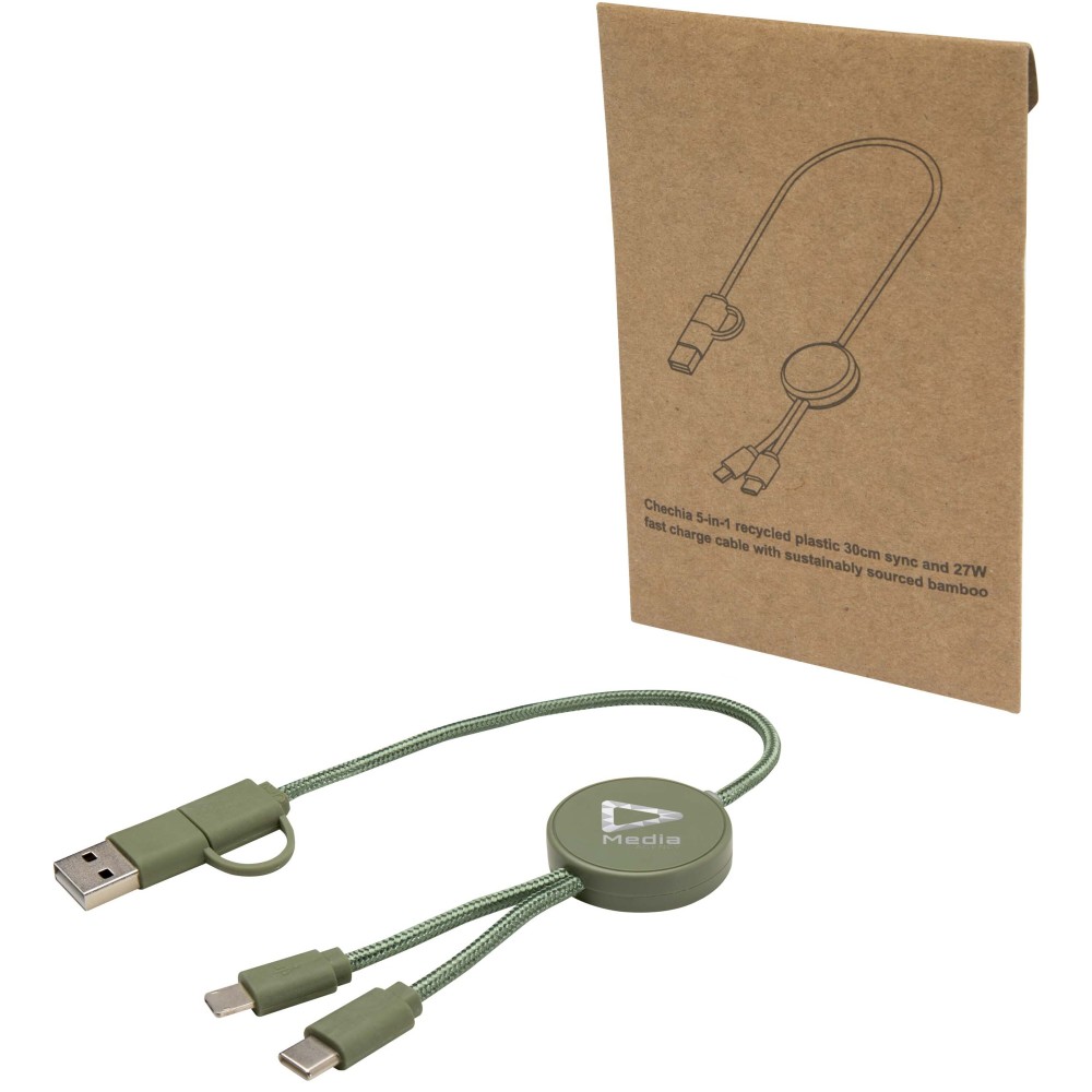 A Citala 5 az 1-ben adat- és 27W-os gyorstöltő kábel újrahasznosított műanyagból készült. A kábel USB-A és Type-C bemeneti csatlakozókkal, valamint Type-C és Lightning/Micro USB kombinált kimeneti csatlakozóval rendelkezik. Az USB-A?USB-C kapcsolat maximális teljesítménye 27W, míg az összes többi kapcsolat maximális teljesítménye 15W. Kompatibilis a CarPlay és az Android Auto rendszerekkel. Akár otthon, az irodában vagy útközben használod, a Citala kábel teljesítményt és stílust biztosít. Kábel hossza: 30 cm. Emblémázás: Tamponnyomás