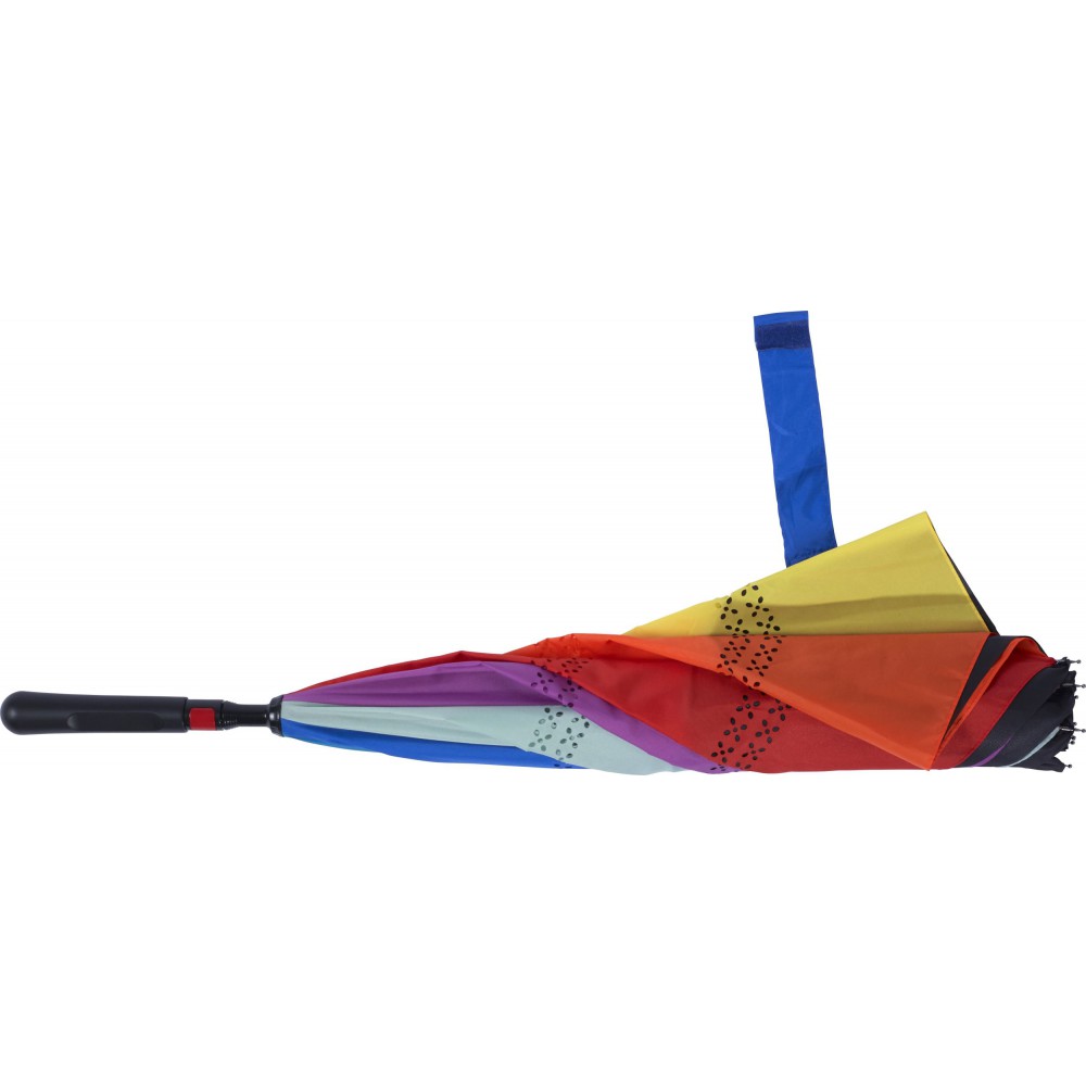 Kifordítható automata esernyő nyolc panellel, fém vázzal, üvegszálas bordázattal, műanyag nyéllel, kétrétegű ernyővel: fekete felső és színes belső vászon. 190T, üvegszál, PVC, vas. Emblémázás: Szitanyomás
