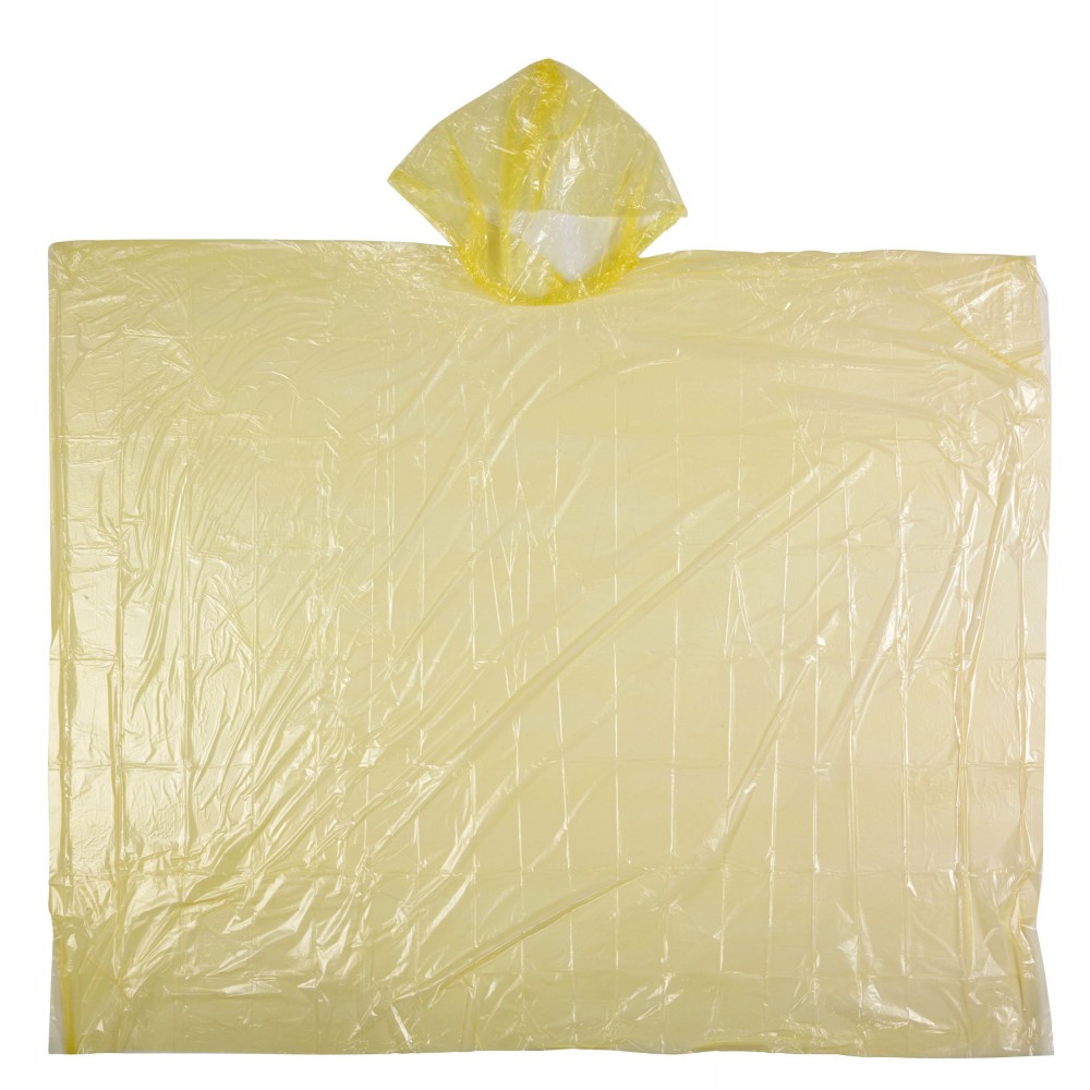 Poncsó szabású esőkabát. Áttetsző vékony PVC, anyaga emblémázásra nem alkalmas. (Egyedi feliratok az esőkabát tokjában elhelyezhető papírlapra készíthetők.) Kiterített mérete: 126*102 cm. Emblémázás: Matricázás