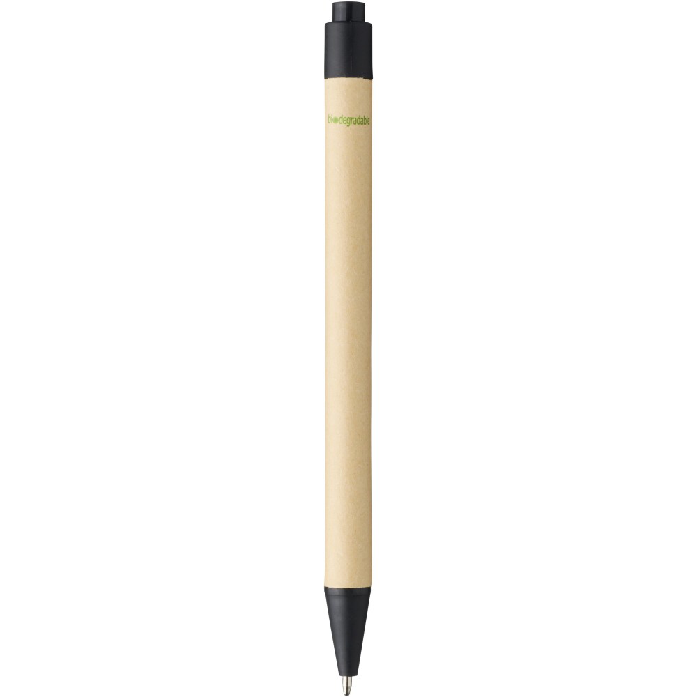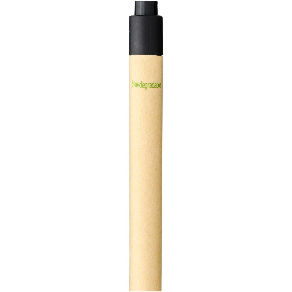 Környezetbarát golyóstoll fekete tollbetéttel, nyomógombos mechanizmussal, biológiailag lebomló papíranyagból készült tolltest és kukorica műanyag kiegészítők. Az újrahasznosított kartondoboz színe nem egységes. Emblémázás: Tamponnyomás, UV nyomtatás