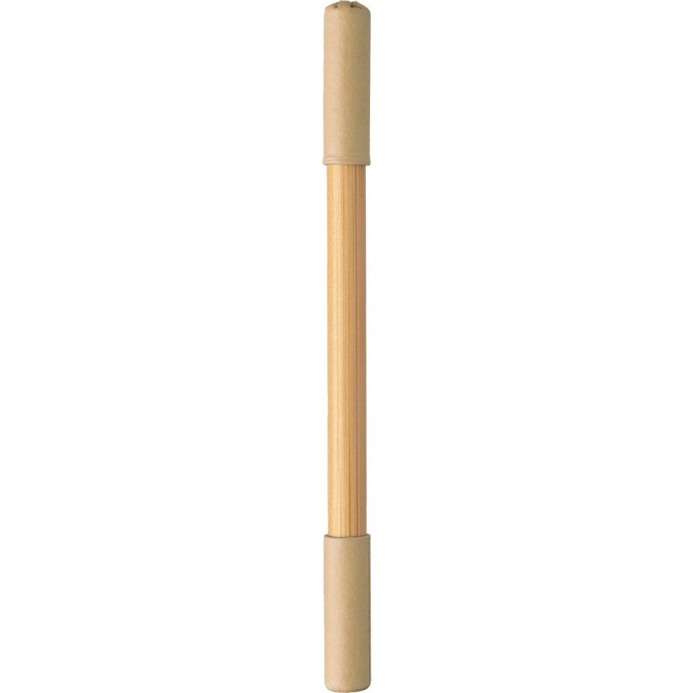 Bambusz végtelenített ceruza és golyóstoll. Az egyik oldalon végtelenített ceruza, a másikon golyóstoll, mindkettő színes karton kupakkal. Kék tollbetéttel. Emblémázás: Gravírozás, Tamponnyomás