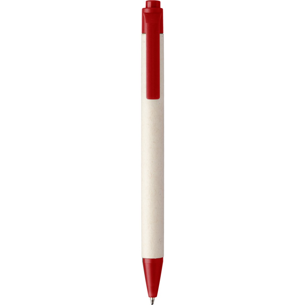 Újrahasznosított tejeskartonból készült golyóstoll újrahasznosított ABS műanyag részekkel. Újrahasznosított ABS logó és újrahasznosított tejeskarton logó jelzi a felhasznált anyagok milyenségét. Kék tollbetéttel. Emblémázás: Tamponnyomás