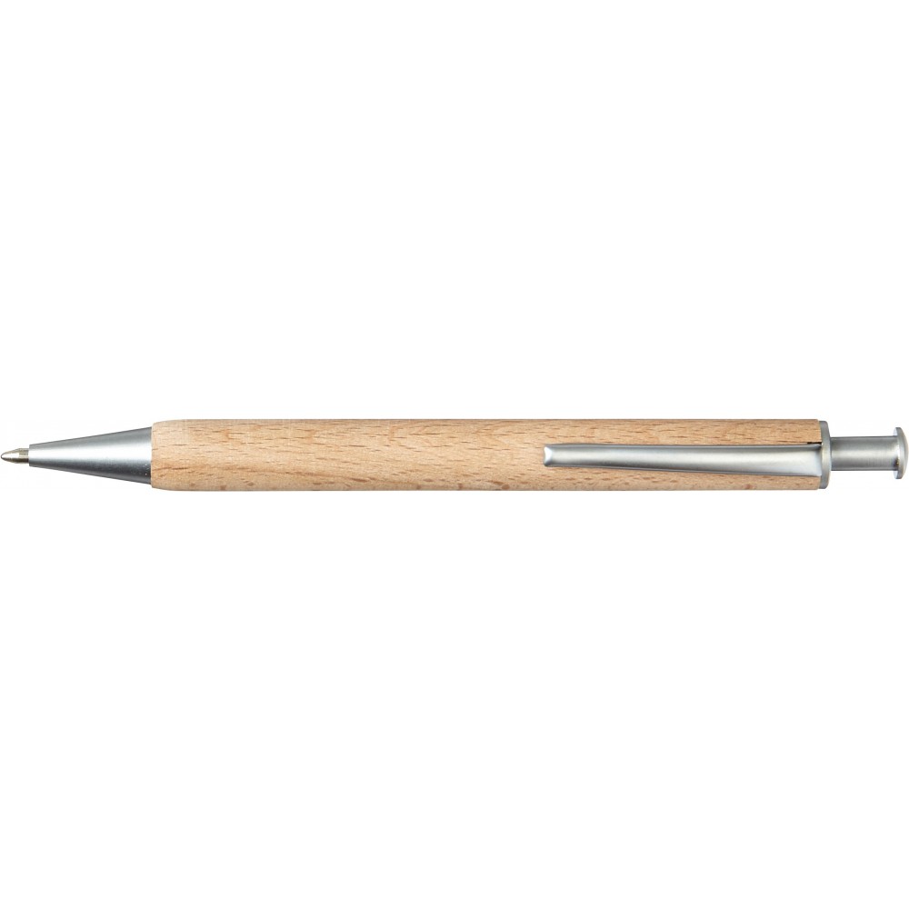 Bükkfa golyóstoll fém kiegészítőkkel, kék tollbetéttel. Emblémázás: Gravírozás, Tamponnyomás