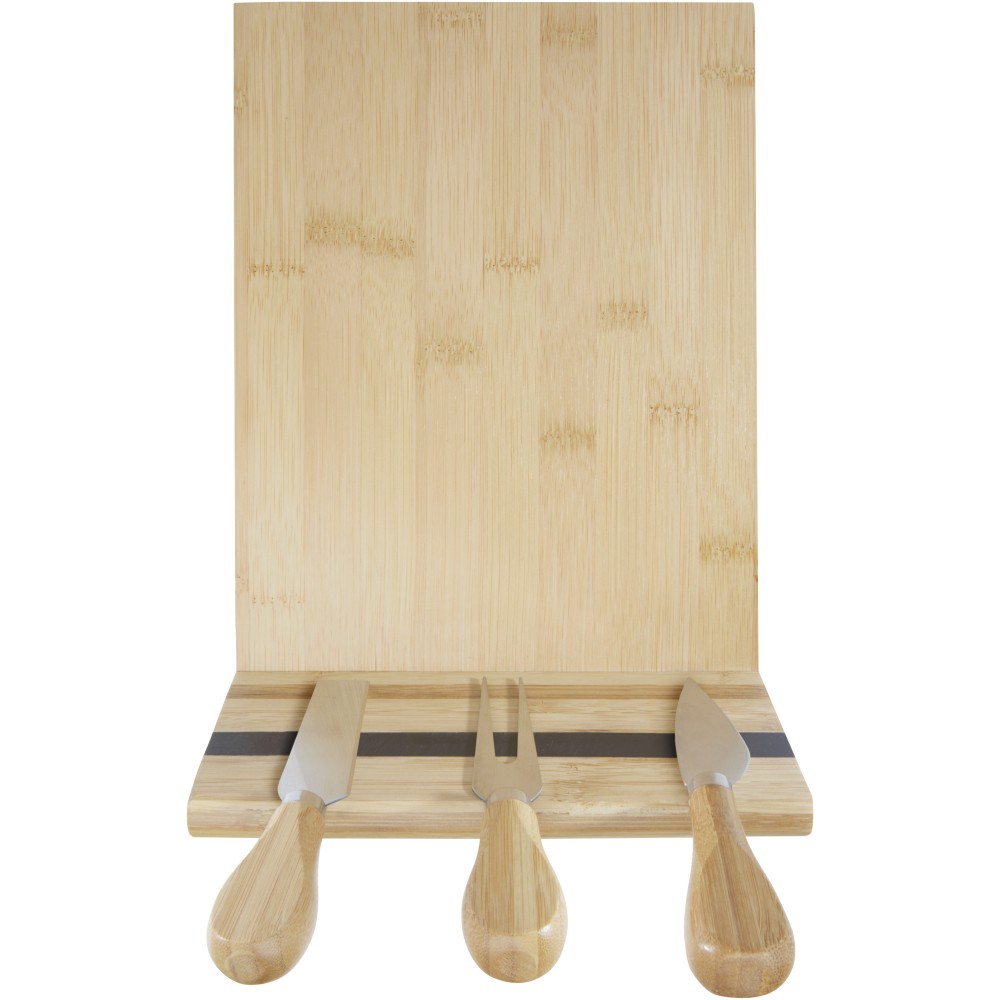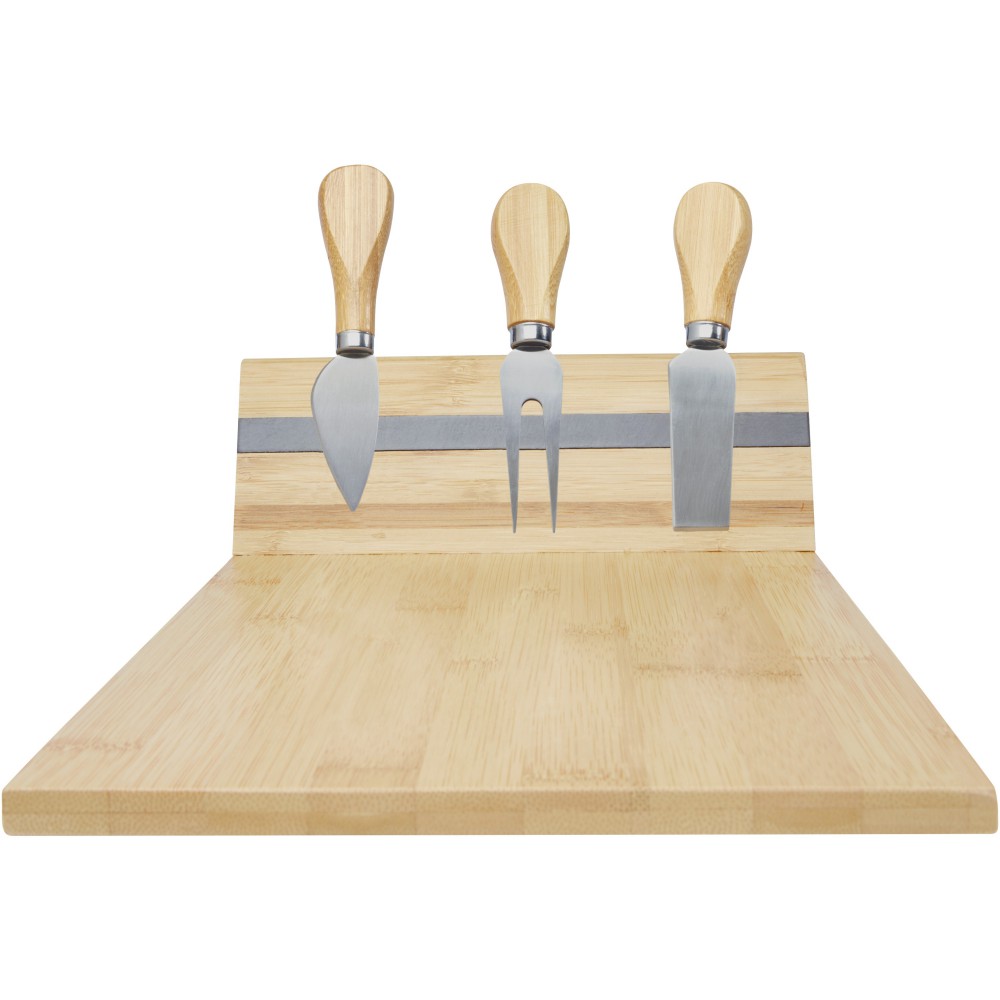 Sajtkészlet bambusz sajtvágó deszkával, (30 x 20,2 x 7,6 cm), 2 sajtkéssel (12,5 x 2,5 cm és 12,5 x 2,7 cm), sajtvillával (13,5 x 2,4 cm). A deszka oldalán egy mágnescsík található az eszközök rögzítéséhez, így stílusosan tálalhatja fel a sajtokat. A felhasznált bambusz forrása és előállítása a fenntartható szabványok szerint történik. Emblémázás: Gravírozás, Tamponnyomás