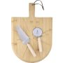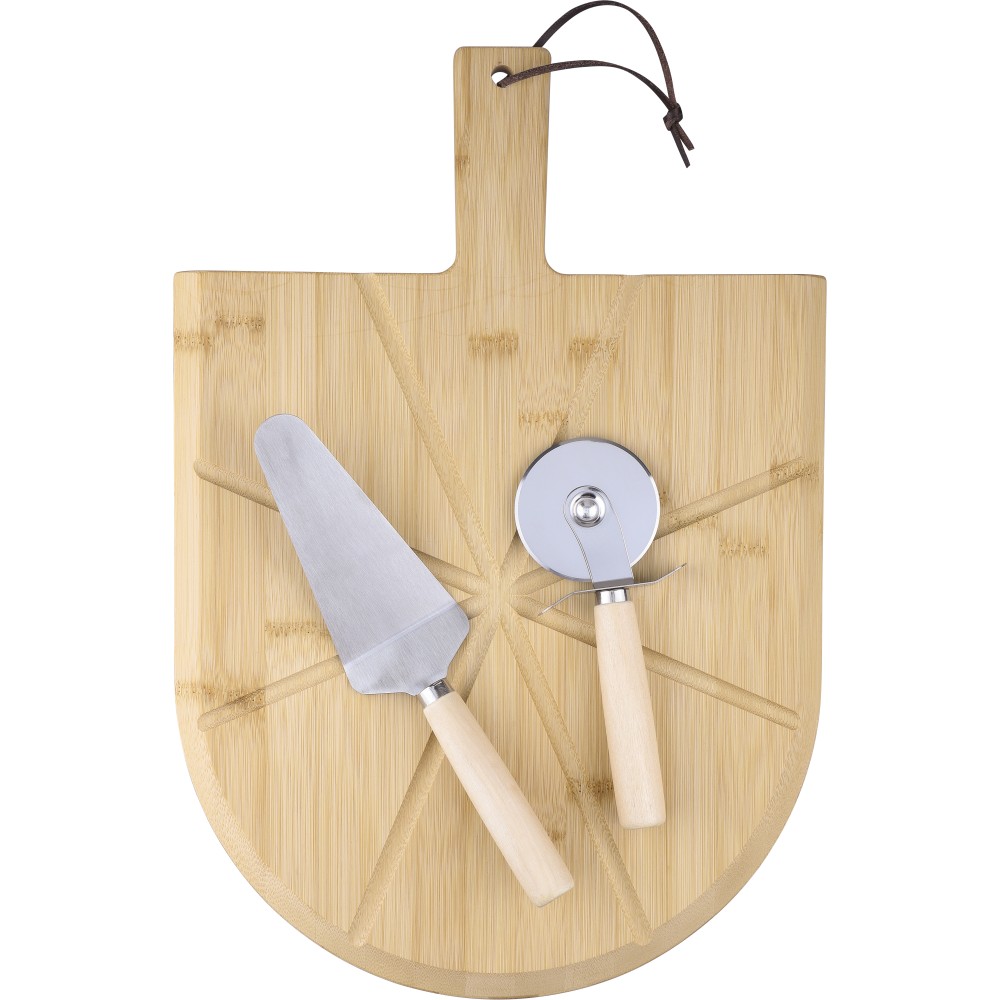 Bambusz pizzavágó deszka nyéllel és a szeletelést könnyítő barázdákkal. A készlet része egy rozsdamentes acélból és bükkfából készült pizzavágó és szervírozólapát is. A deszka nyelén PU akasztószalag található. Csomagolása barna papírdoboz. Emblémázás: Gravírozás