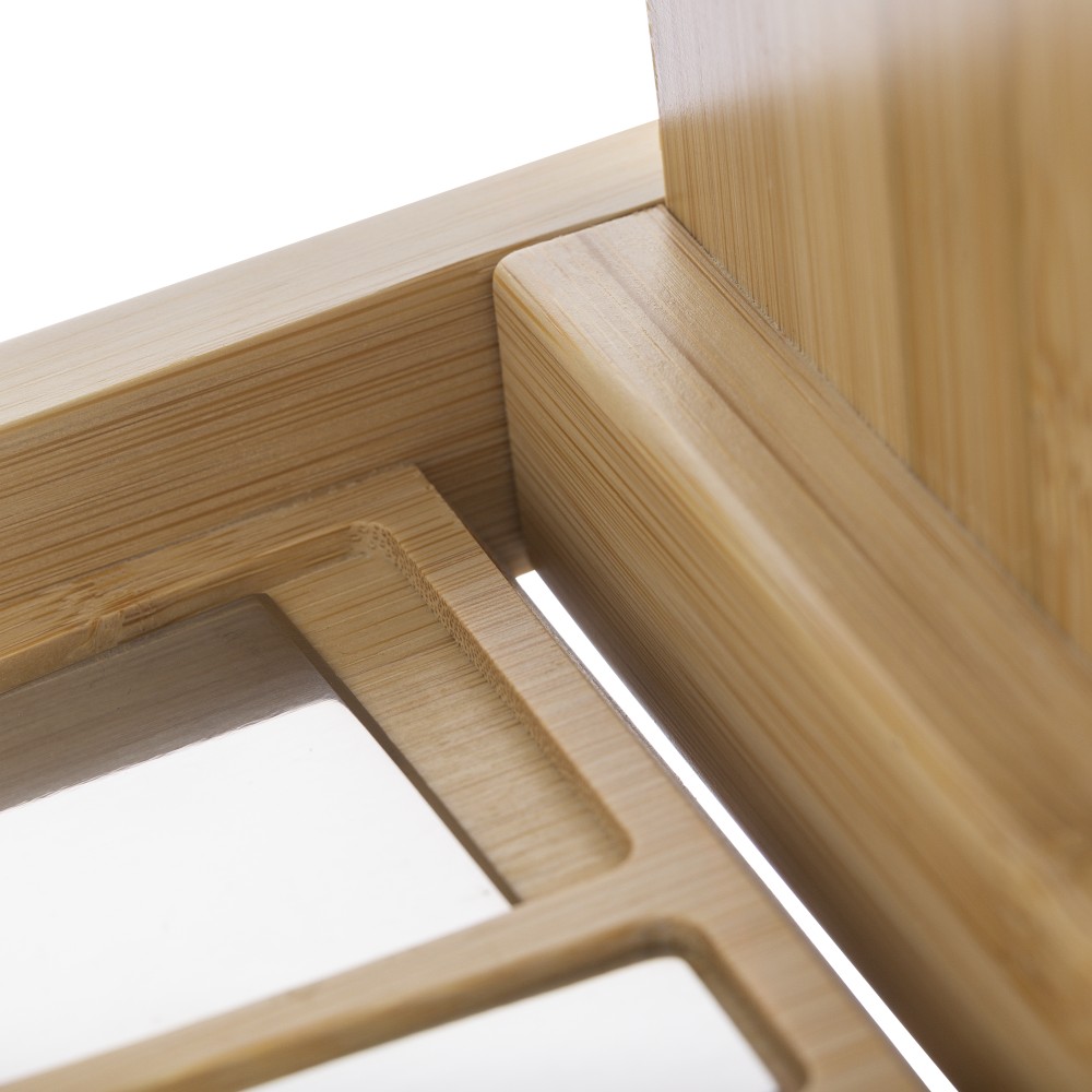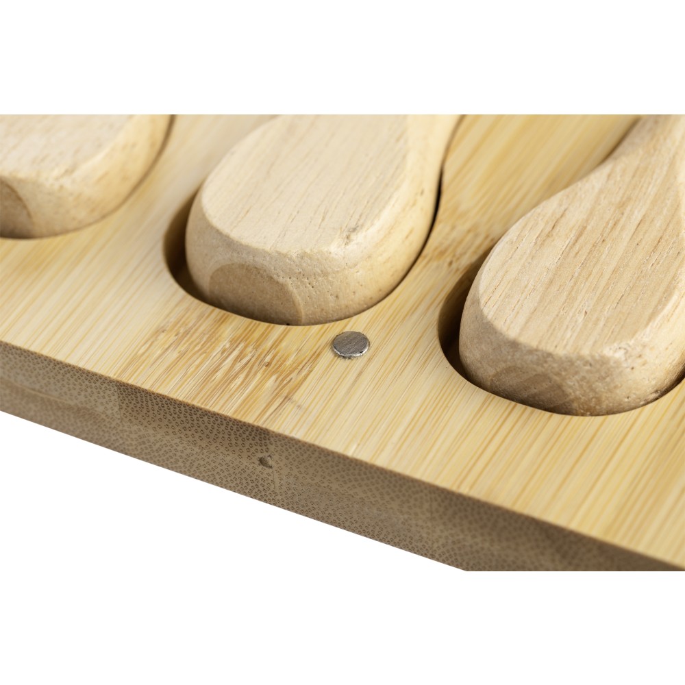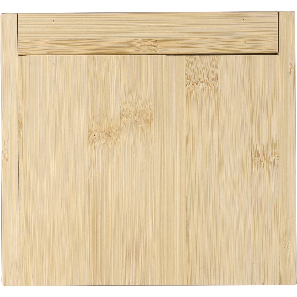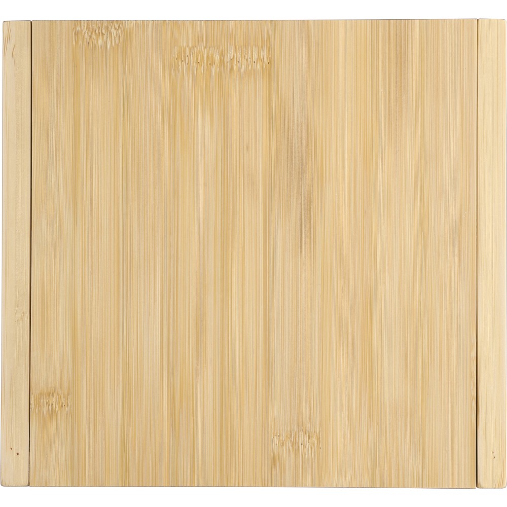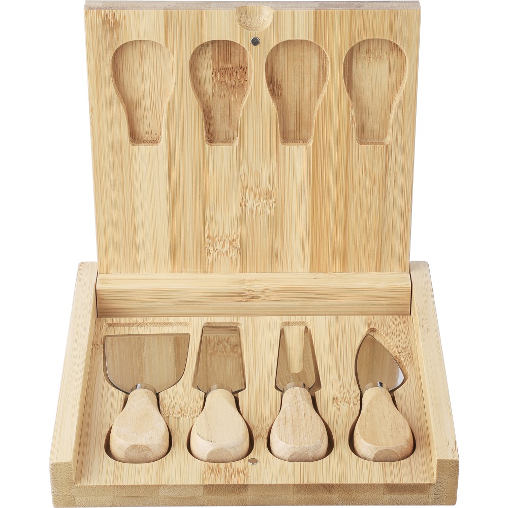 Bambusz sajtvágó deszka kihajtható fedéllel és 4 db, bükkfa nyéllel rendelkező rozsdamentes acél eszközzel. A dobozban kényelmesen elhelyezhető minden sajtkés. Csomagolása barna papírdoboz. Emblémázás: Gravírozás