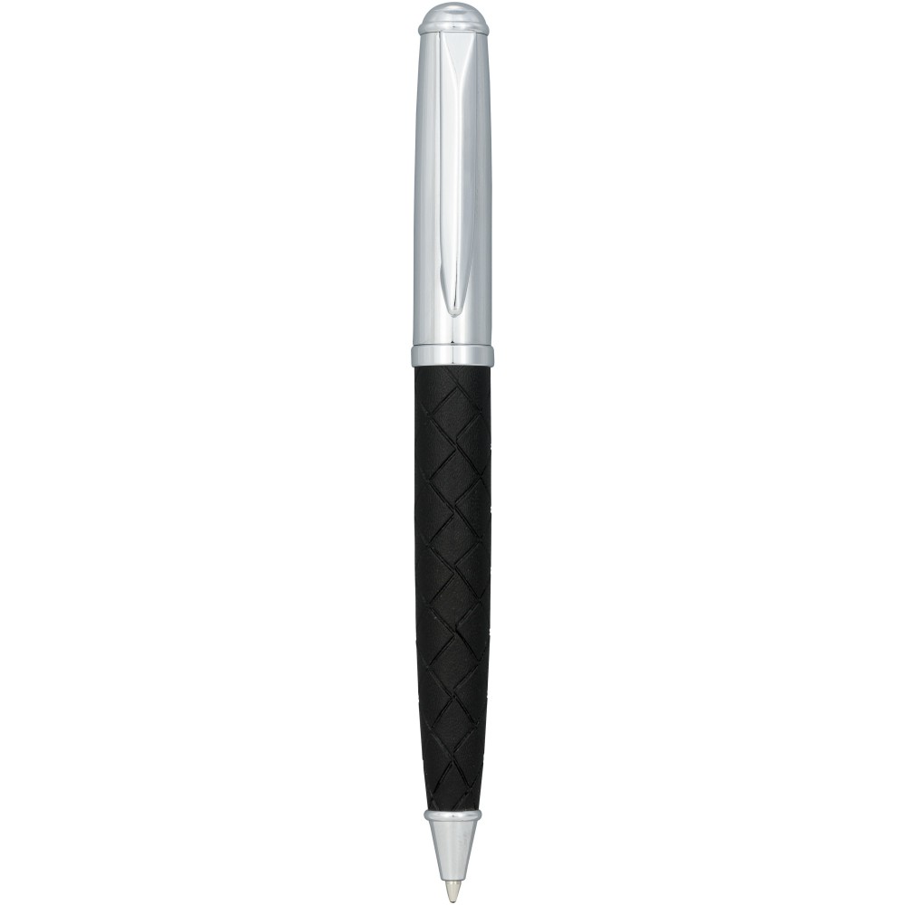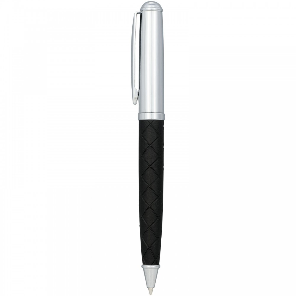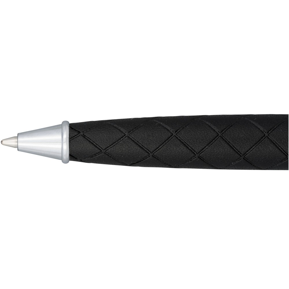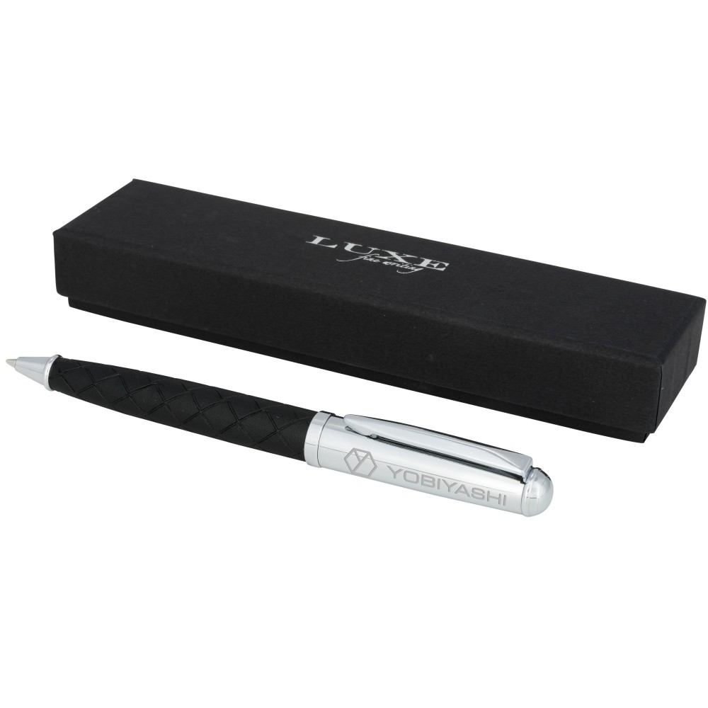 Gömbölyded golyóstoll, alsó része bőr mintázatú dekorációval lett ellátva. Prémium minőségű fekete tollbetéttel. Csomagolása Luxe ajándékdoboz. Fém és műbőr. Emblémázás: Tamponnyomás