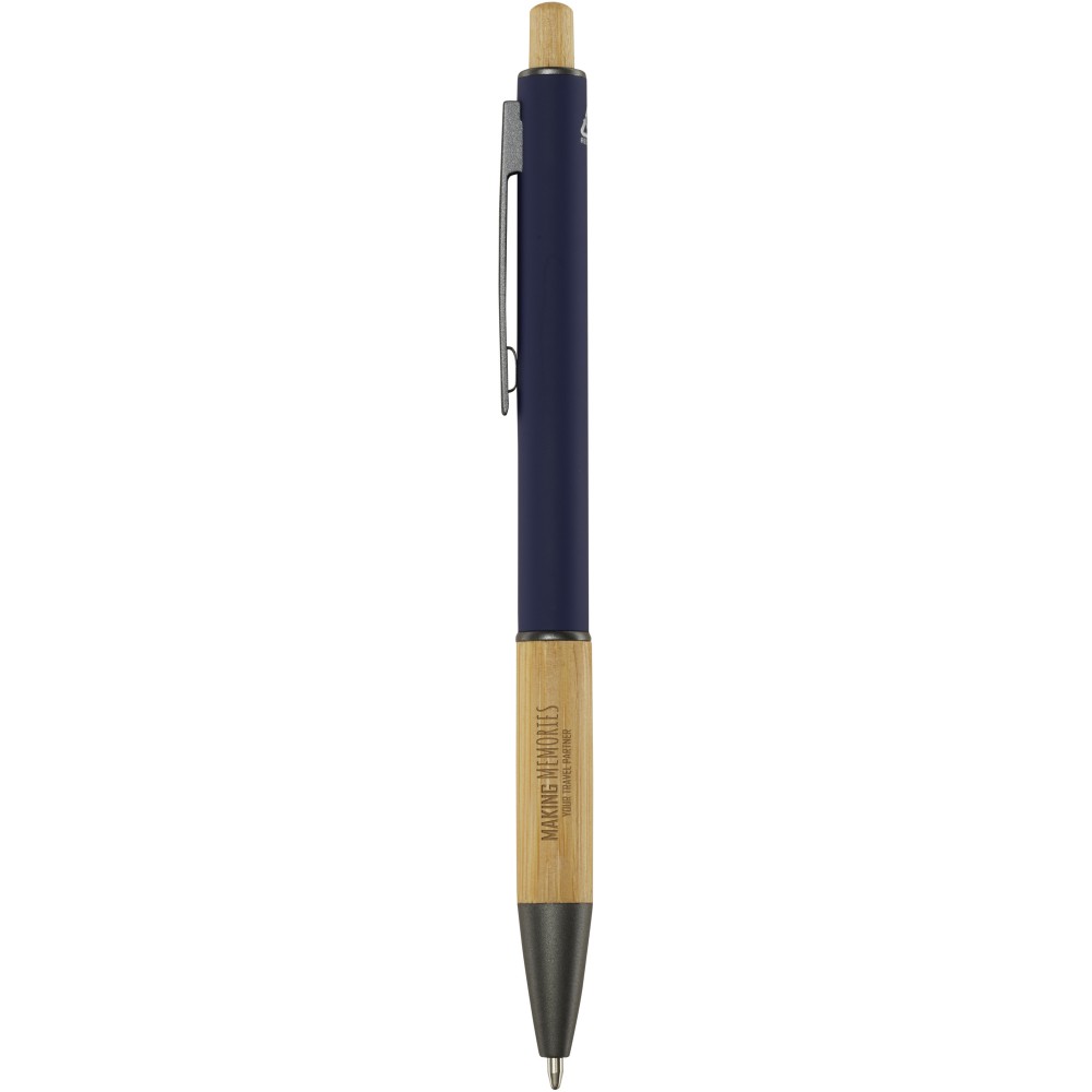A Darius golyóstoll újrahasznosított alumíniumból készül, ami kevesebb energiát igényel, mint az alumínium nyersanyagból történő előállítása. Emellett csökkenti a hulladéklerakókba kerülő hulladék mennyiségét és hozzájárul a természeti erőforrások megőrzéséhez, amelynek célja az üvegházhatású gázok kibocsátásának csökkentése. A nyomógomb és a tolltest alsó része bambuszból készült. A Tollbetét színe: fekete. Íráshossz: 800 méter. Tollhegy mérete: 1,00 mm Emblémázás: Gravírozás, UV nyomtatás