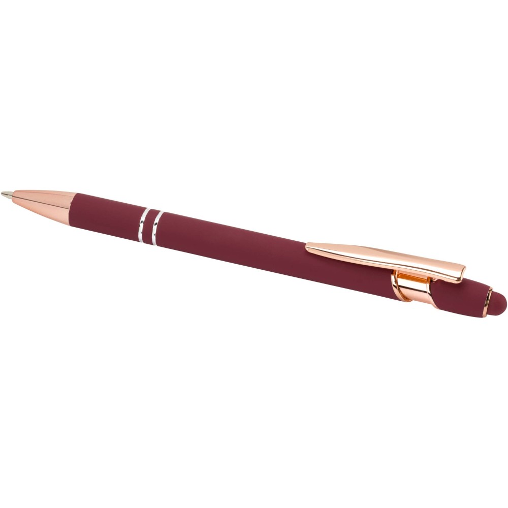 Nanna golyóstoll elegáns rózsaarany színben. A toll teste újrahasznosított alumíniumból, az érintőceruza pedig szilikonból készült, így érintőképernyős eszközökhöz is használható. Az újrahasznosított alumínium csökkenti a hulladéklerakók terhelését, segít megőrizni a természeti erőforrásokat, és célja az üvegházhatású gázok kibocsátásának mérséklése. Tinta színe: kék. Íráshossz: 800 méter. Tollhegy mérete: 1,0 mm. Emblémázás: Gravírozás, UV nyomtatás