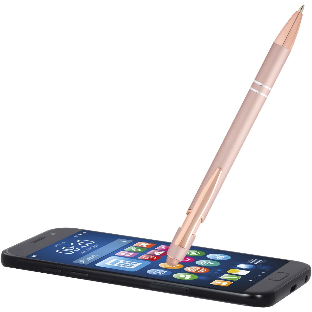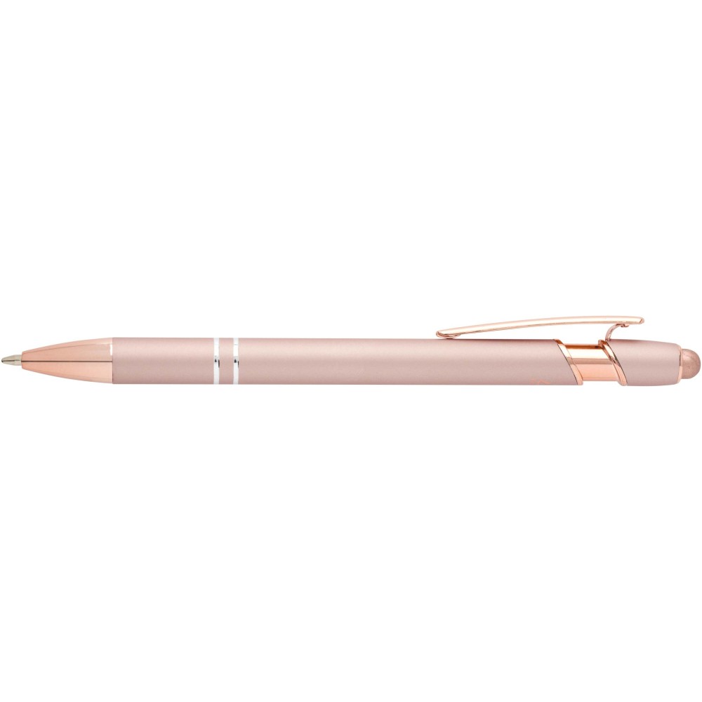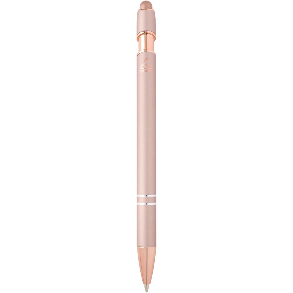Nanna golyóstoll elegáns rózsaarany színben. A toll teste újrahasznosított alumíniumból, az érintőceruza pedig szilikonból készült, így érintőképernyős eszközökhöz is használható. Az újrahasznosított alumínium csökkenti a hulladéklerakók terhelését, segít megőrizni a természeti erőforrásokat, és célja az üvegházhatású gázok kibocsátásának mérséklése. Tinta színe: kék. Íráshossz: 800 méter. Tollhegy mérete: 1,0 mm. Emblémázás: Gravírozás, UV nyomtatás