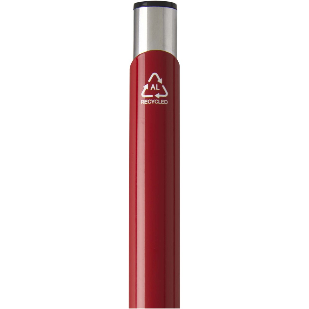Golyóstoll újrahasznosított alumíniumból, lakkozott felülettel és króm részletekkel. Az újrahasznosított alumínium csökkenti a hulladéklerakók terhelését, segít megőrizni a természeti erőforrásokat és hozzájárul az üvegházhatású gázok kibocsátásának csökkentéséhez. Tinta színe: kék. Íráshossz: 1000 méter. Tollhegy mérete: 1,0 mm. Emblémázás: Gravírozás, Tamponnyomás