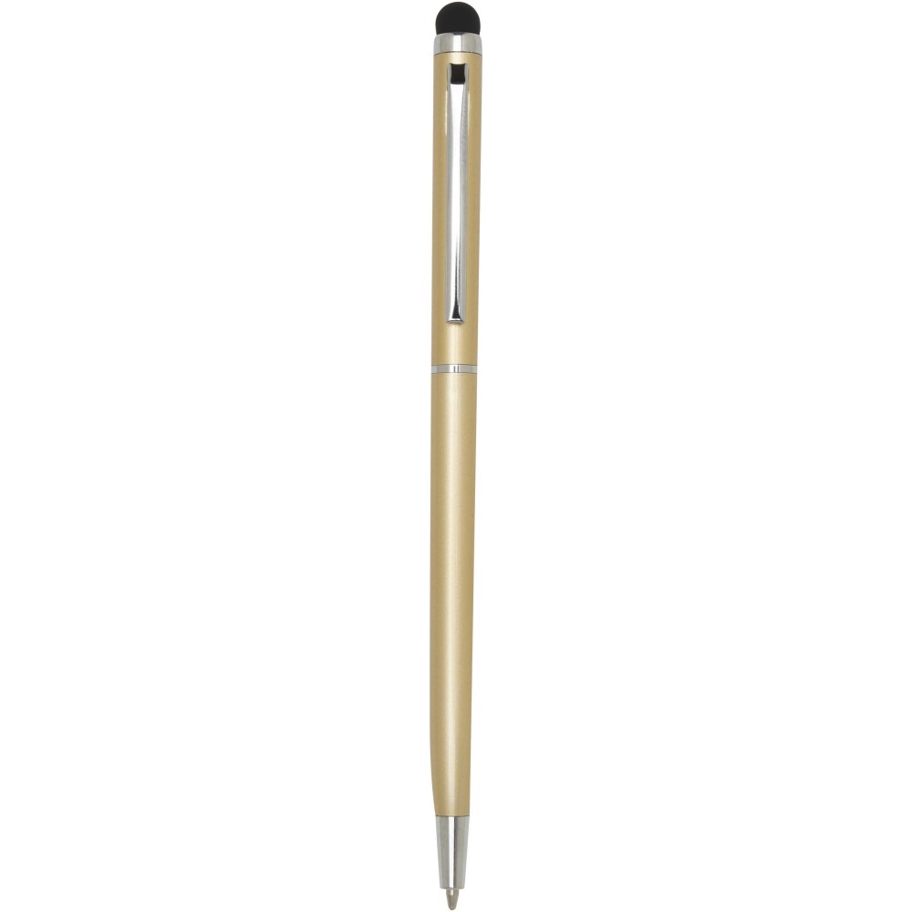 Ez a sokoldalú érintőceruzával ellátott golyóstoll tartós alumíniumból készült. A toll sima írást biztosít, míg a beépített érintőképernyős vég a pontos online navigációhoz ideális. Tinta színe: kék. Íráshossz: 1000 méter. Tollhegy mérete: 1,0 mm. Emblémázás: Gravírozás
