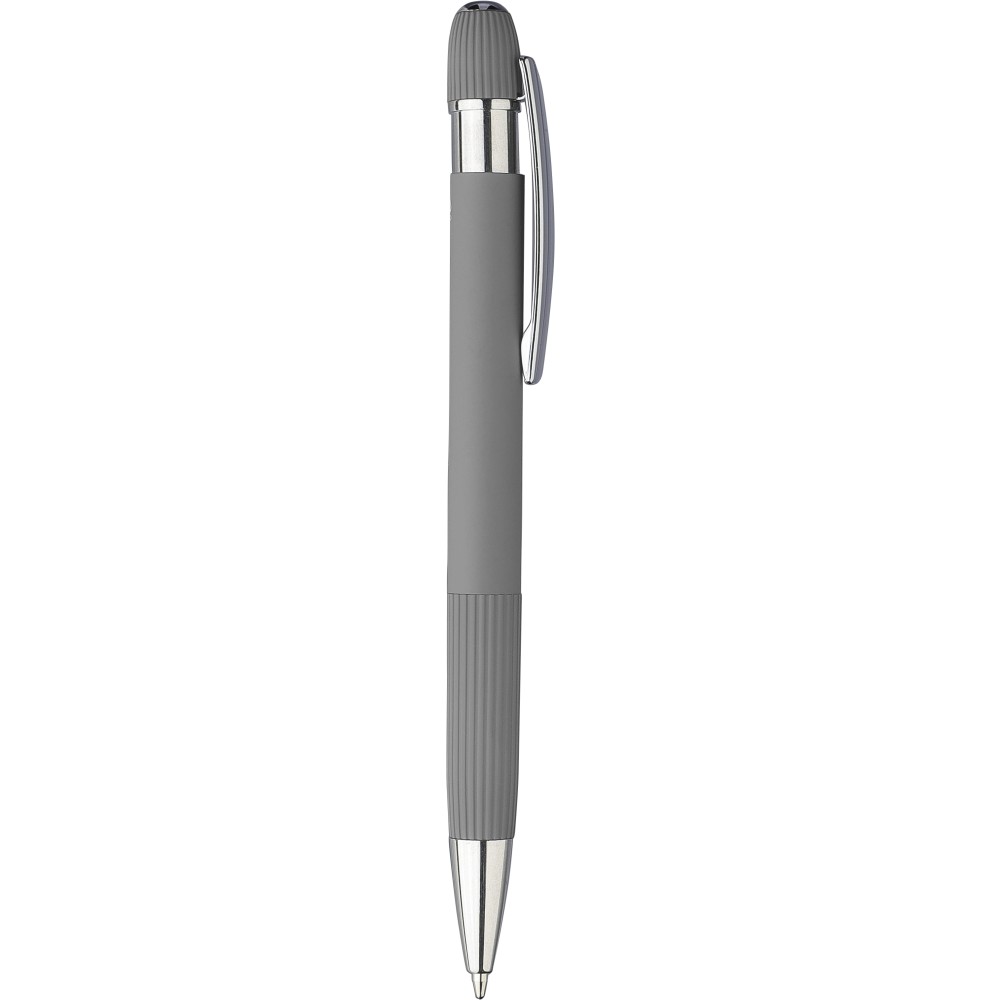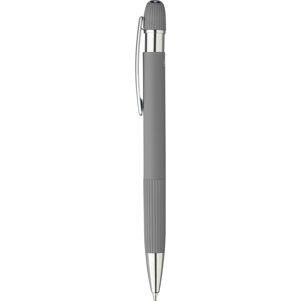 Újrahasznosított alumínium golyóstoll gumírozott felülettel. Bordázott részletekkel a markolaton és a tetején, krómozott műanyag heggyel és fém klipsszel ellátott nyomógombbal. Lézergravírozott újrahasznosított logóval. Kék tintával. Emblémázás: Gravírozás