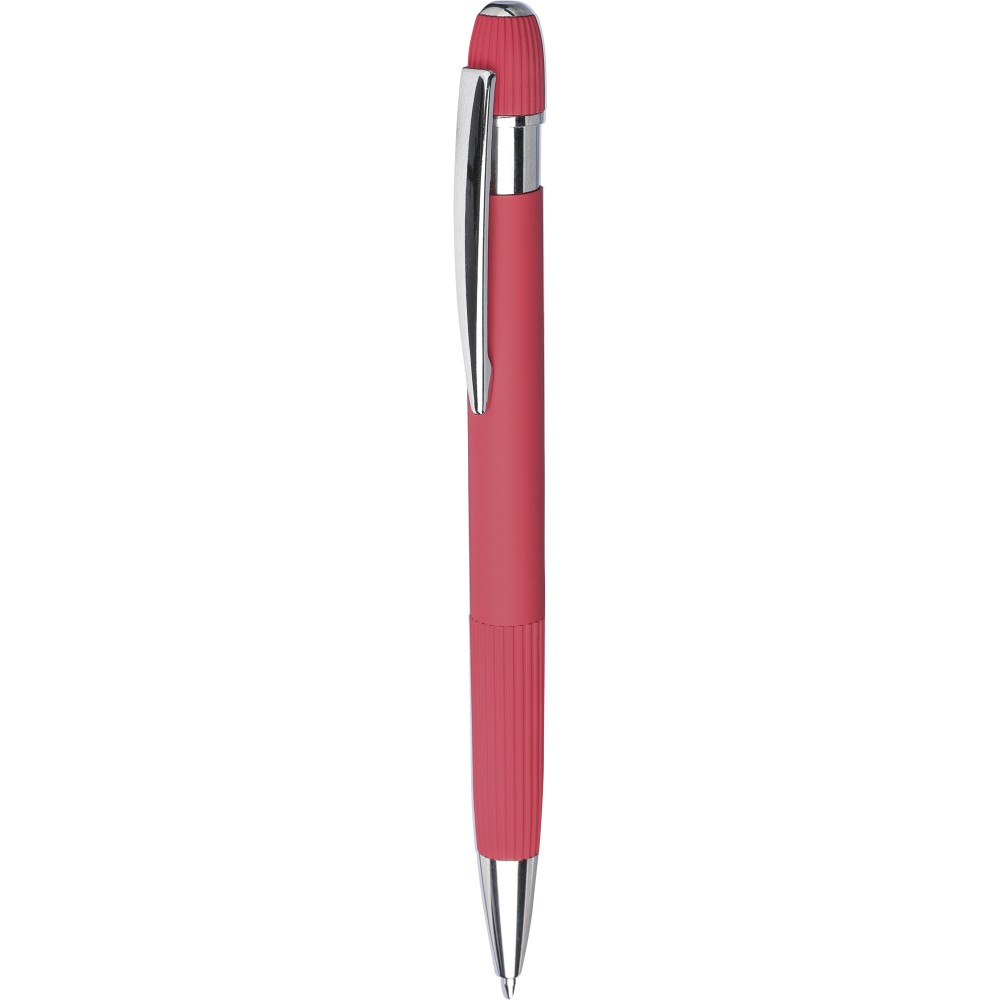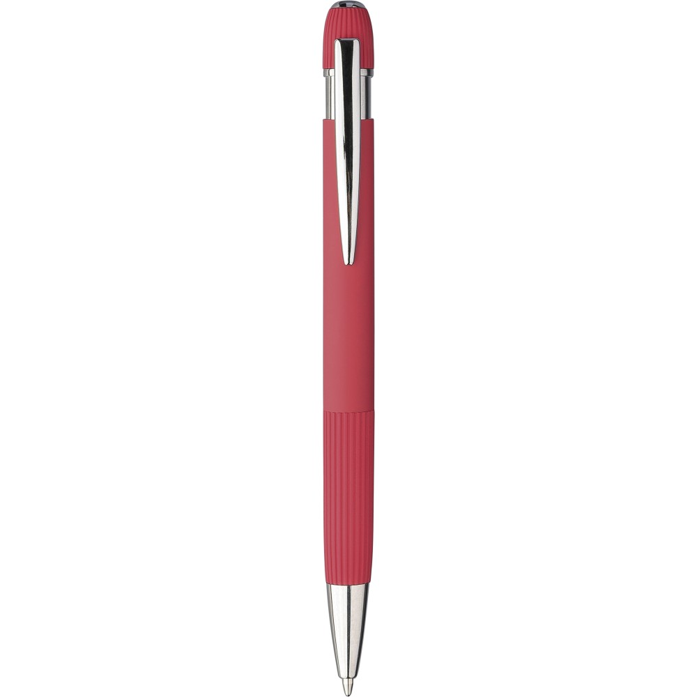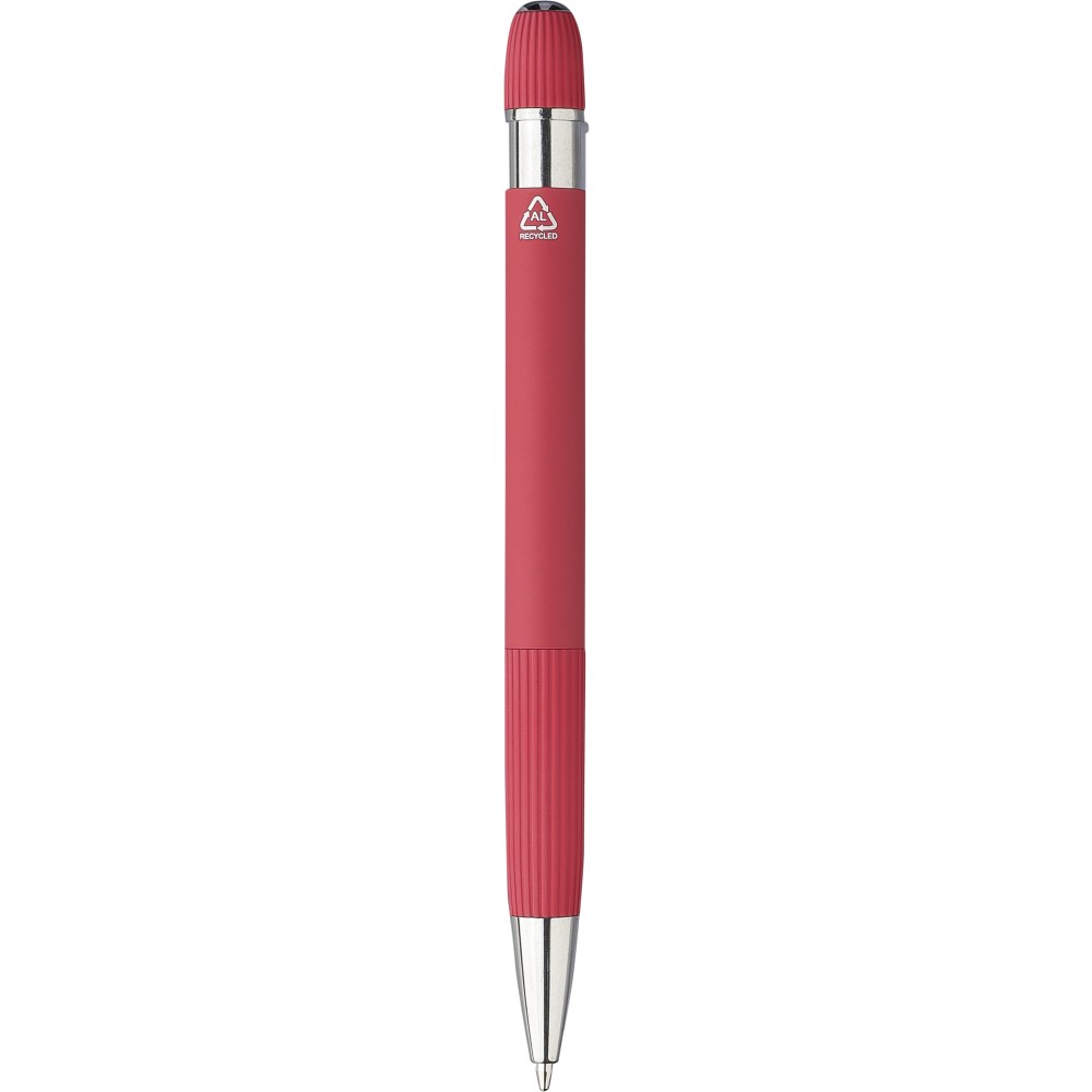 Újrahasznosított alumínium golyóstoll gumírozott felülettel. Bordázott részletekkel a markolaton és a tetején, krómozott műanyag heggyel és fém klipsszel ellátott nyomógombbal. Lézergravírozott újrahasznosított logóval. Kék tintával. Emblémázás: Gravírozás