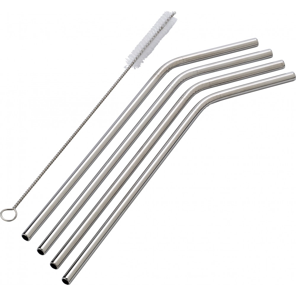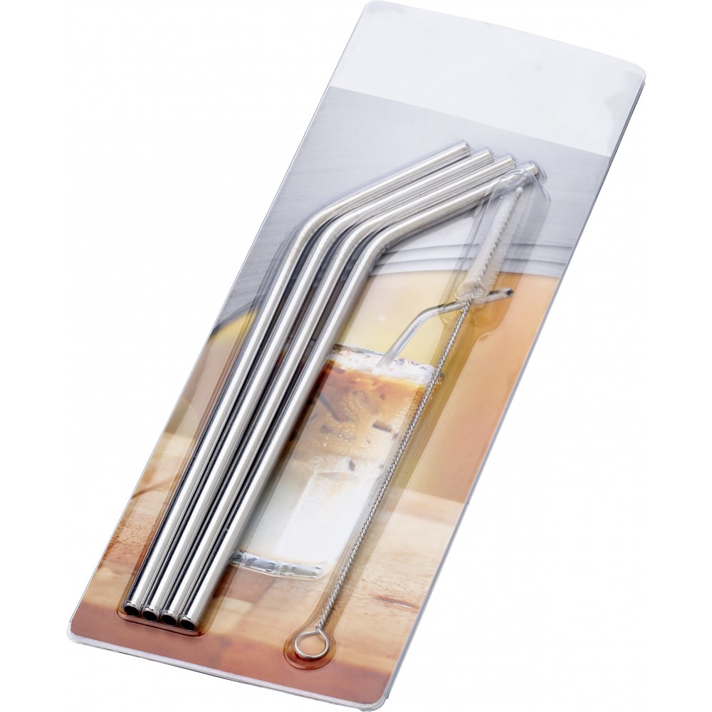 Négy rozsdamentes acél, környezetbarát, sokszor használatos szívószál. A készlet tartalmaz egy tisztítókefét. Emblémázás: Gravírozás