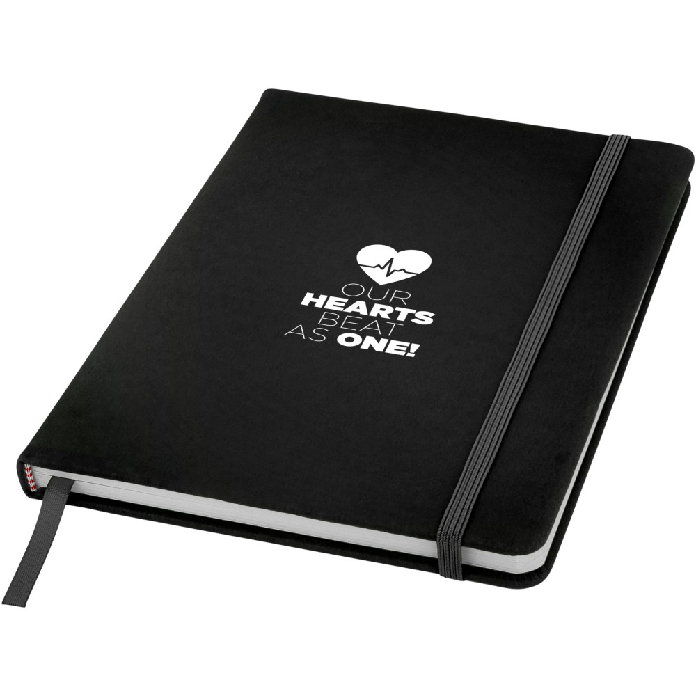 Spectrum A/5 jegyzetfüzet színes fedéllel, jelölőszalaggal és gumipánttal, 96 vonalas lappal (60g/m2). Emblémázás: Szitanyomás, Tamponnyomás, UV nyomtatás