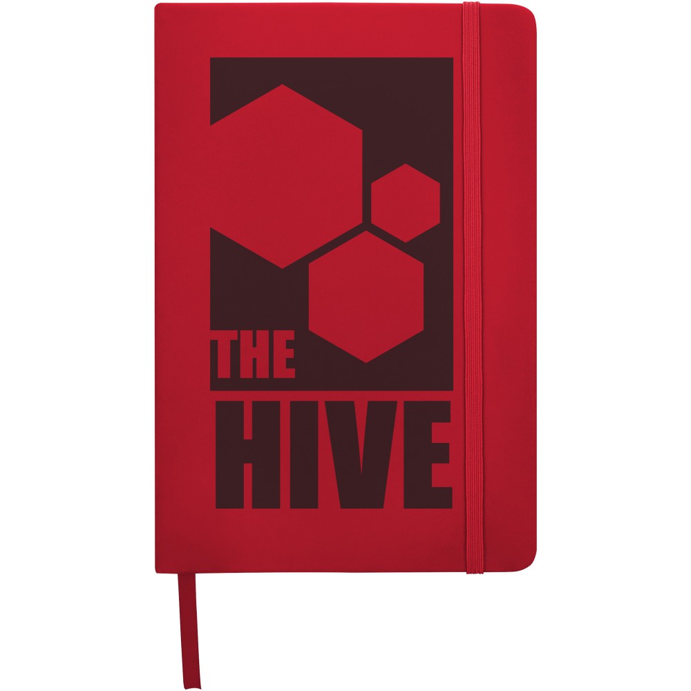 Spectrum A/5 jegyzetfüzet színes fedéllel, jelölőszalaggal és gumipánttal, 96 vonalas lappal (60g/m2). Emblémázás: Szitanyomás, Tamponnyomás, UV nyomtatás