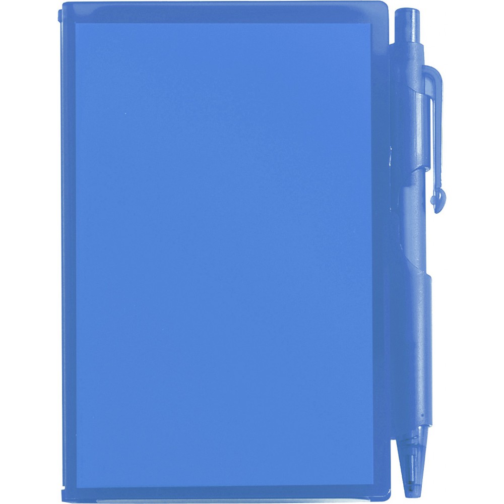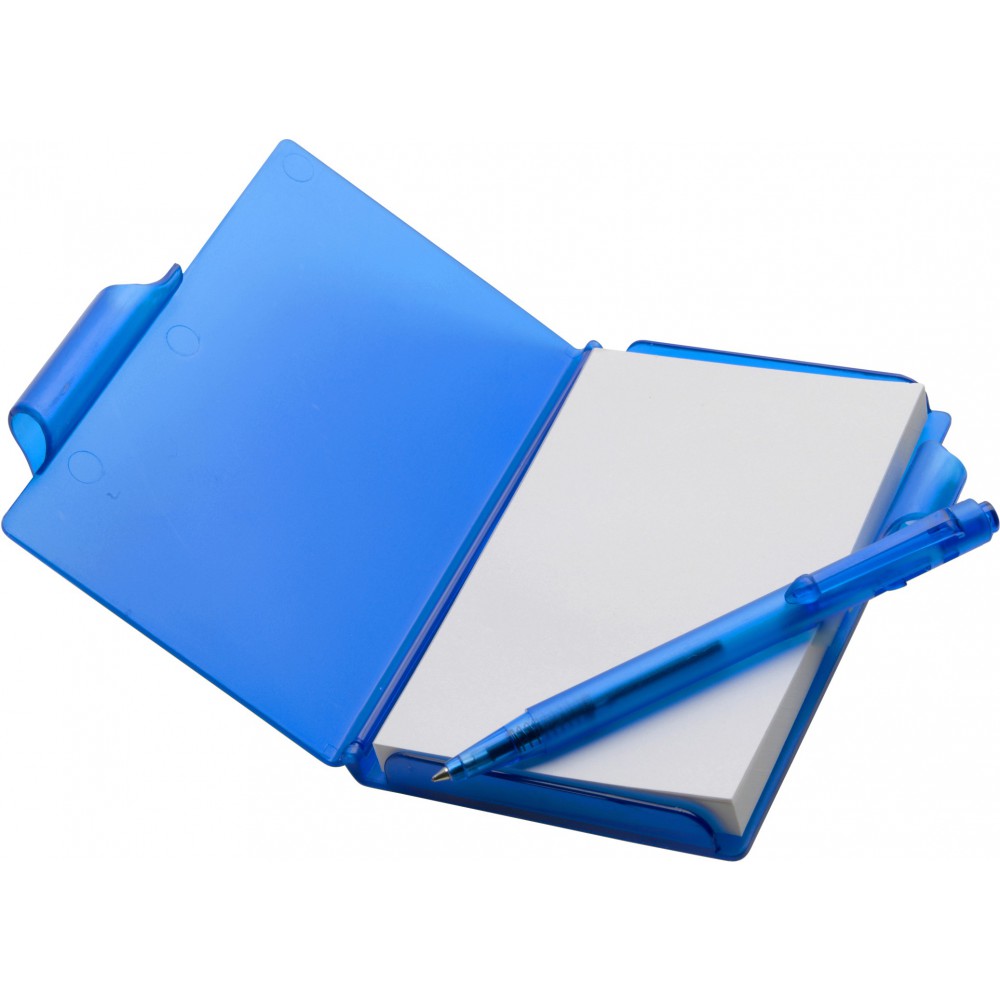 Jegyzettömb műanyag tokban (kb. 100 lapos) és golyóstoll fekete tollbetéttel. Emblémázás: Matricázás, Tamponnyomás, UV nyomtatás