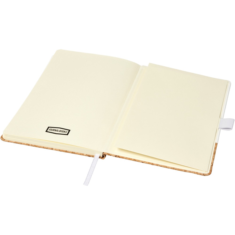 A5 méretű műbőr füzet parafa borítással, színes gumis záródással és könyvjelzővel. 80 db (80gsm) krémszínű lappal és zsebbel a hátsó, belső borítón. Csomagolás fekete dobozban. Emblémázás: Tamponnyomás, UV nyomtatás