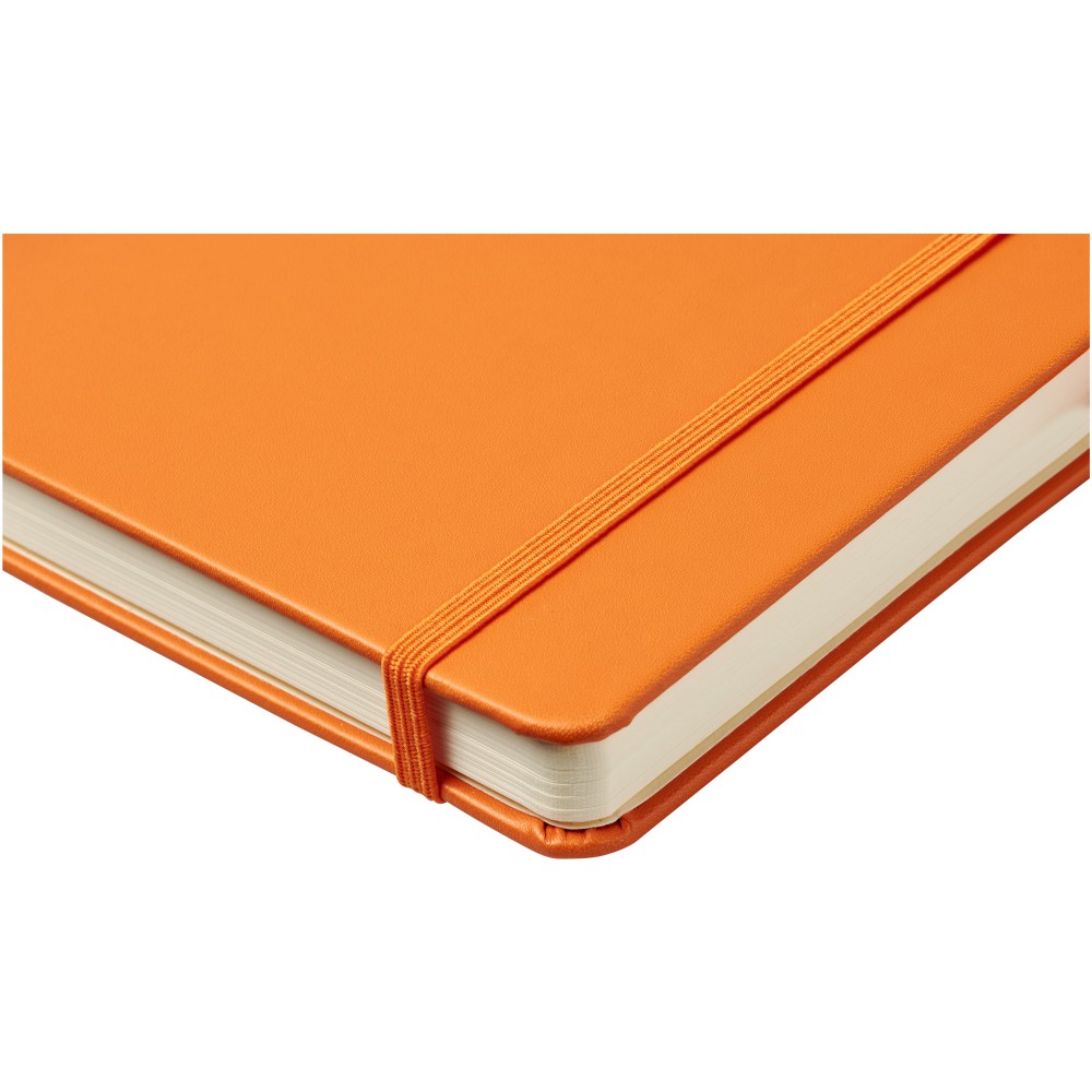 Műbőr A5-ös (14,2 cm x 21,4 cm) jegyzetfüzet gumiszalaggal, szalagjelölővel, tollhurokkal és harmonika hátsó zsebbel. 96 db vonalas krémszínű lapot tartalmaz (80 g/m2). Emblémázás: Tamponnyomás, UV nyomtatás