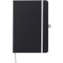 A5 füzet 96 vonalas lappal, könyvjelzővel, gumis zárópánttal. Lézergravírozás után a gravírozott felület színe megegyezik a gumipánt színével. PU anyag. Emblémázás: Tamponnyomás, UV nyomtatás