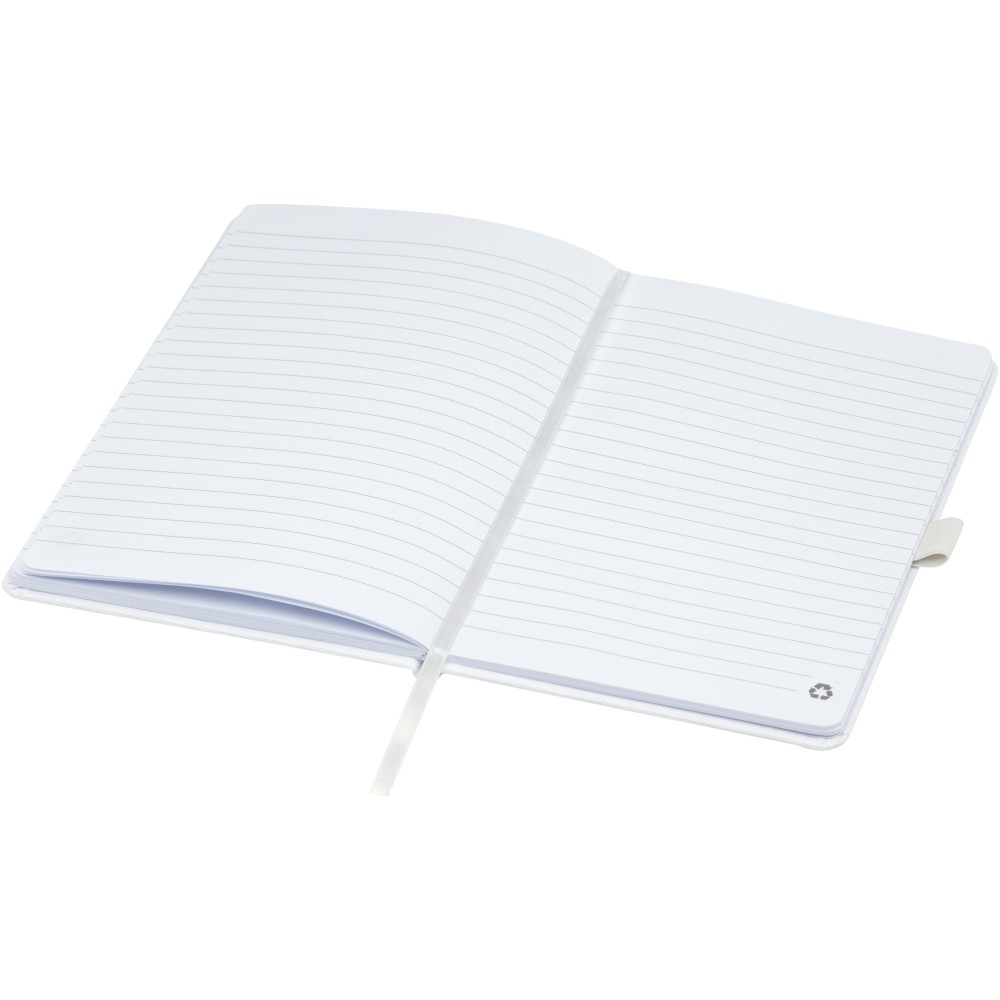 A5 jegyzetfüzet újrahasznosított PET műanyagból készült szövet borítóval. 80 lap 70 g/m2 újrahasznosított, vonalas papír, tolltartó hurok és szalag könyvjelző. Kombinálható a 107757 Honua RPET golyóstollal. Emblémázás: Szitanyomás