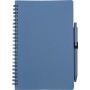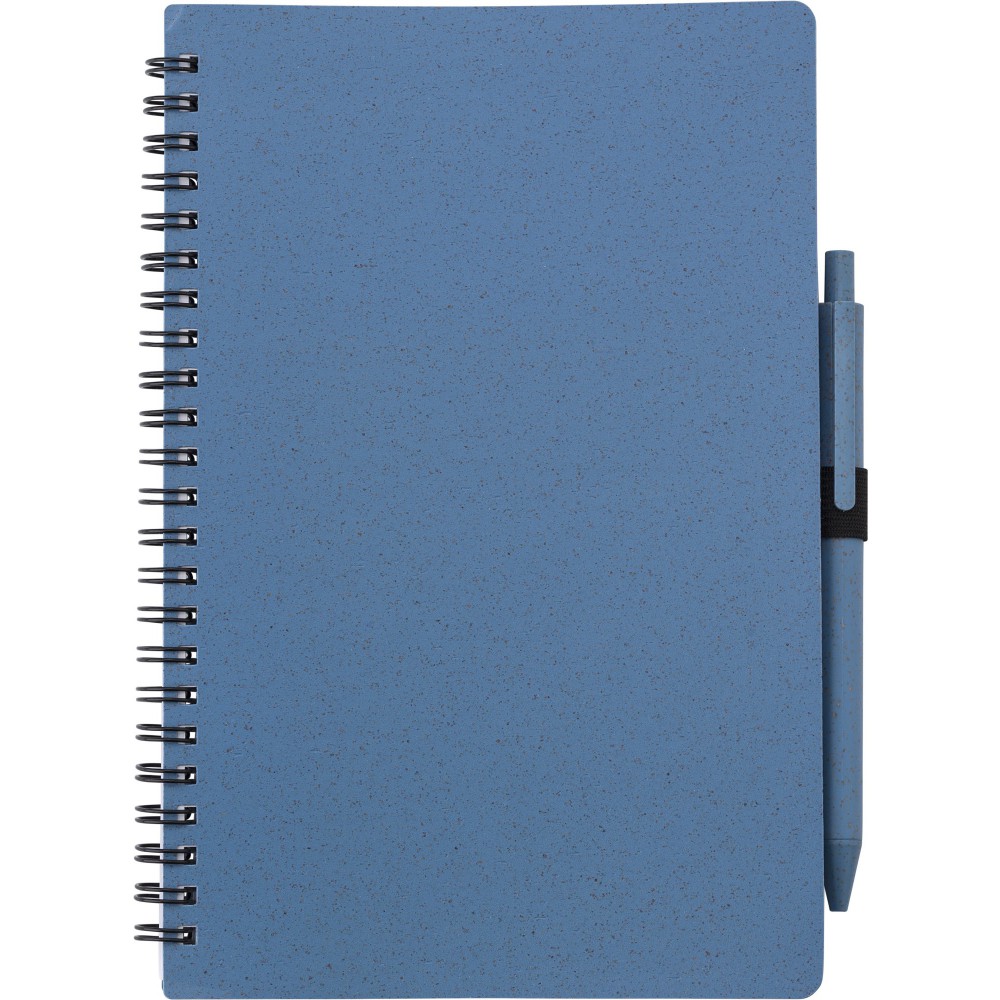 Szalma és PP műanyag felhasználásával készült füzet és golyóstoll (kék tollbetéttel). 70 vonalas lap. Kb. A5-ös méret. Emblémázás: Szitanyomás, Tamponnyomás