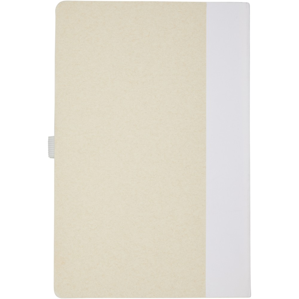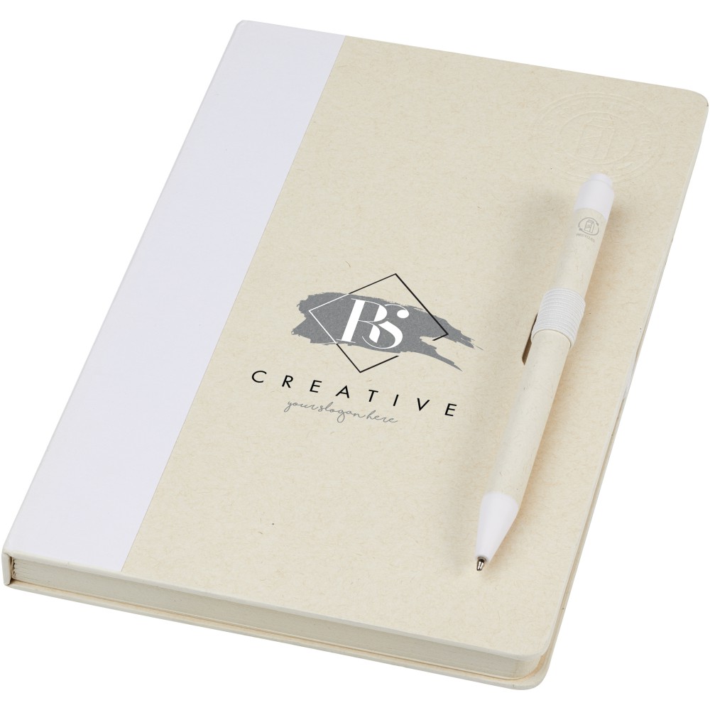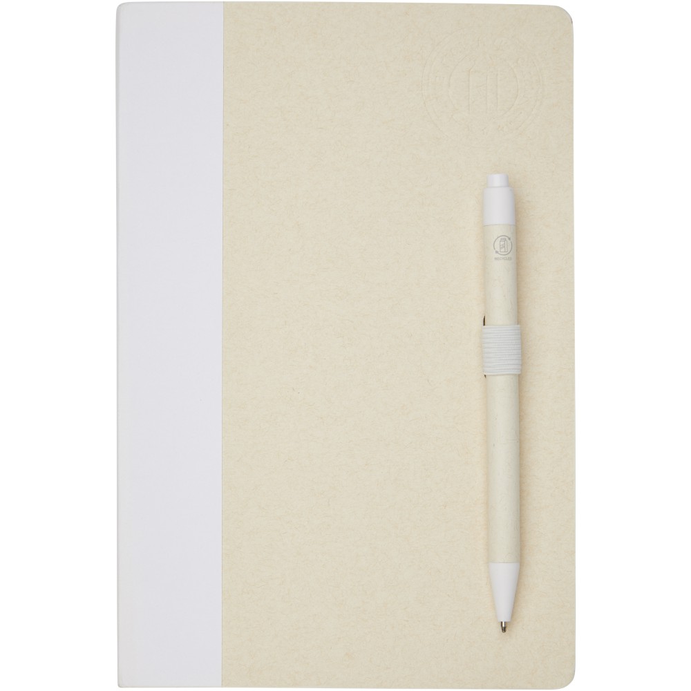 A5 méretű füzet és golyóstoll készlet. A jegyzetfüzet 80 vonalas lapot (80 g/m2) tartalmaz, amelyek újrahasznosított tejes kartondobozokból készülnek (akár 70%), színes papírgerinccel és egy tollhurokkal. A tollhurokban egy nyomógombos golyóstoll található a jegyzetfüzet színéhez illő színben. A toll teste ugyanabból az újrahasznosított anyagból készült, a gomb, a klipsz és a hegy pedig színes PLA műanyagból készült. A toll fekete tollbetéttel érkezik. A használt tejesdobozokat összegyűjtik, válogatják, feldolgozzák és papírrá alakítják, így a hulladékból hasznos termék készül. Emblémázás: Szitanyomás, Tamponnyomás