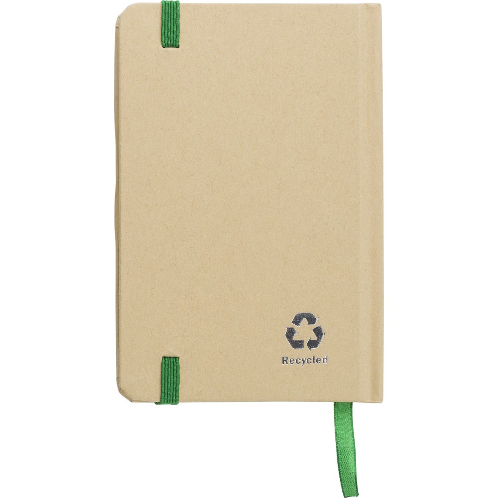 Újrahasznosított kraft papírból készült A6-os jegyzetfüzet 160 vonalas lappal, gumis pánttal és szalag könyvjelzővel. Emblémázás: Szitanyomás, Tamponnyomás